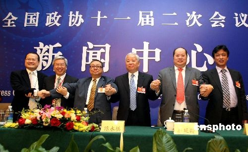 3月10日,全國政協(xié)十一屆二次會議舉行“港澳委員談如何應(yīng)對全球金融危機”專題記者會,陳永棋、李家祥、張華鋒、蔡冠深、許健康、顏延齡委員回答記者提問。記者會結(jié)束后,六位港澳委員手拉手,表示共同對抗金融危機。中新社發(fā) 傅丹丹 攝