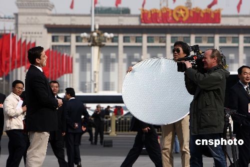 3月10日,外國(guó)媒體在北京人民大會(huì)堂前現(xiàn)場(chǎng)報(bào)道兩會(huì)。當(dāng)日,十一屆全國(guó)人大二次會(huì)議在人民大會(huì)堂舉行第三次全體大會(huì),最高人民法院院長(zhǎng)王勝俊、最高人民檢察院檢察長(zhǎng)曹建明分別作工作報(bào)告。中新社發(fā) 杜洋 攝