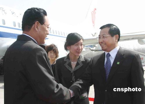 應(yīng)國務(wù)院總理溫家寶的邀請(qǐng)對(duì)中國進(jìn)行正式友好訪問的朝鮮內(nèi)閣總理金英日,三月十七日中午由北京乘機(jī)抵達(dá)濟(jì)南。圖為山東省副省長才利民(右)在濟(jì)南國際機(jī)場(chǎng)迎接金英日總理。中新社發(fā) 張璐 攝