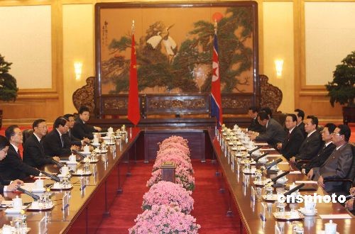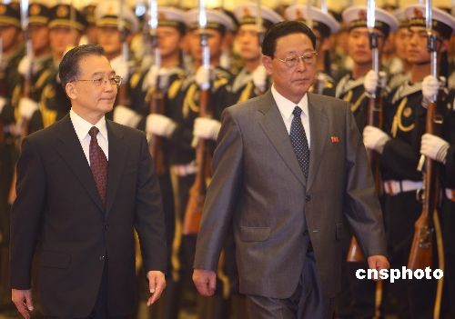 3月18日下午,中國總理溫家寶在北京人民大會(huì)堂舉行儀式,歡迎朝鮮民主主義人民共和國內(nèi)閣總理金英日訪華。中新社發(fā) 任晨鳴 攝