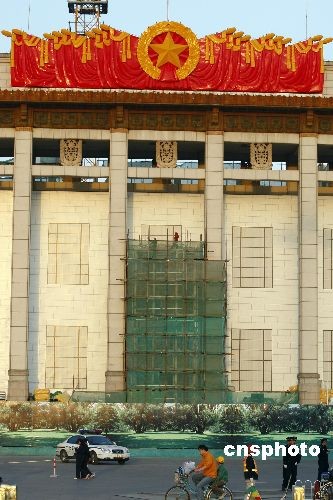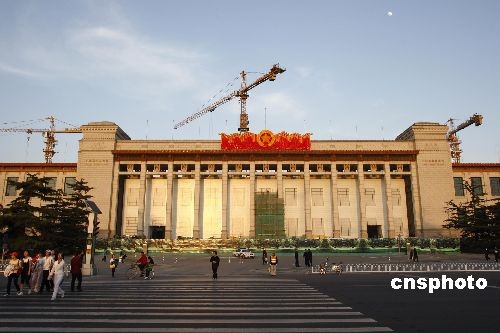 4月6日,中國(guó)國(guó)家博物館西門(mén)前罩上了綠色圍擋,工作人員正在加緊搭建上海世博會(huì)倒計(jì)時(shí)牌。據(jù)悉,該倒計(jì)時(shí)牌將于2009年5月1日上海世博會(huì)倒計(jì)時(shí)一周年之際正式亮相。全國(guó)政協(xié)常委、上海世博會(huì)執(zhí)委會(huì)執(zhí)行主任萬(wàn)季飛在“兩會(huì)”期間表示,上海世博會(huì)將于明年5月1日開(kāi)幕,在倒計(jì)時(shí)一周年之際,組委會(huì)將于今年5月1日在天安門(mén)廣場(chǎng)和國(guó)家博物館西門(mén)前豎立上海世博會(huì)倒計(jì)時(shí)牌,7月5日到15日將在首都博物館舉辦走進(jìn)世博會(huì)大型巡展。中新社發(fā) 鄭雄增 攝