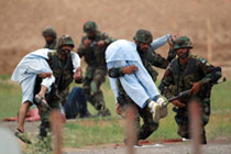 7月3日,代號“友誼—2010”的中國巴基斯坦反恐聯(lián)合訓練在中國寧夏青銅峽地區(qū)展開,此次訓練主要以邊境地區(qū)山地聯(lián)合反恐作戰(zhàn)為課題,分為展示交流、混編同訓、綜合演練三個階段。圖為中方反恐特種兵突入戰(zhàn)術(shù)課目訓練。 中新社發(fā) 杜洋 攝
