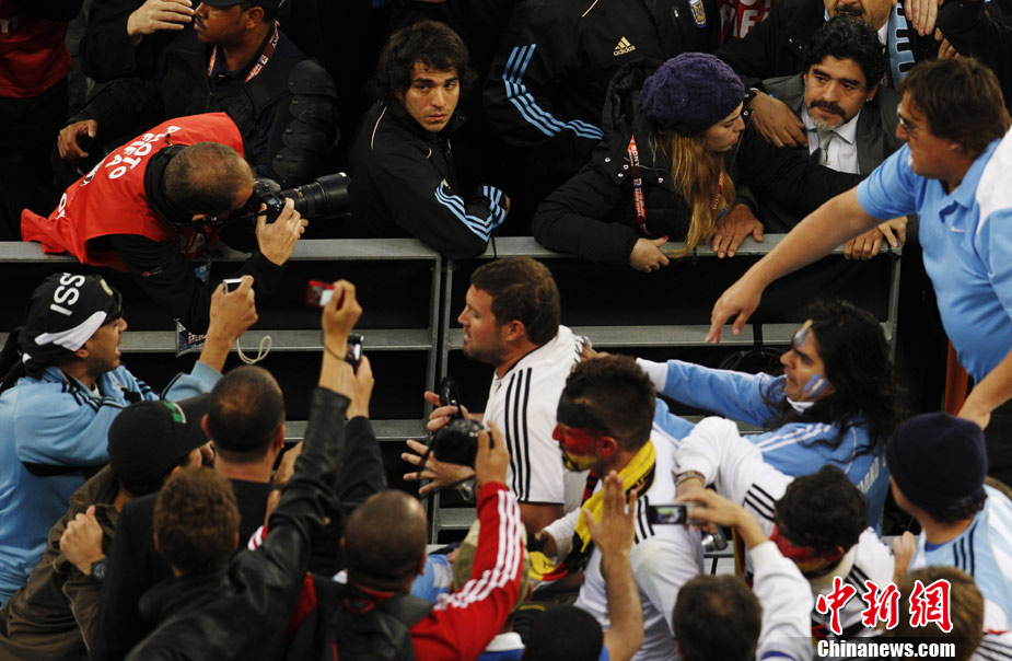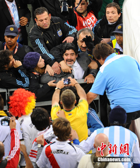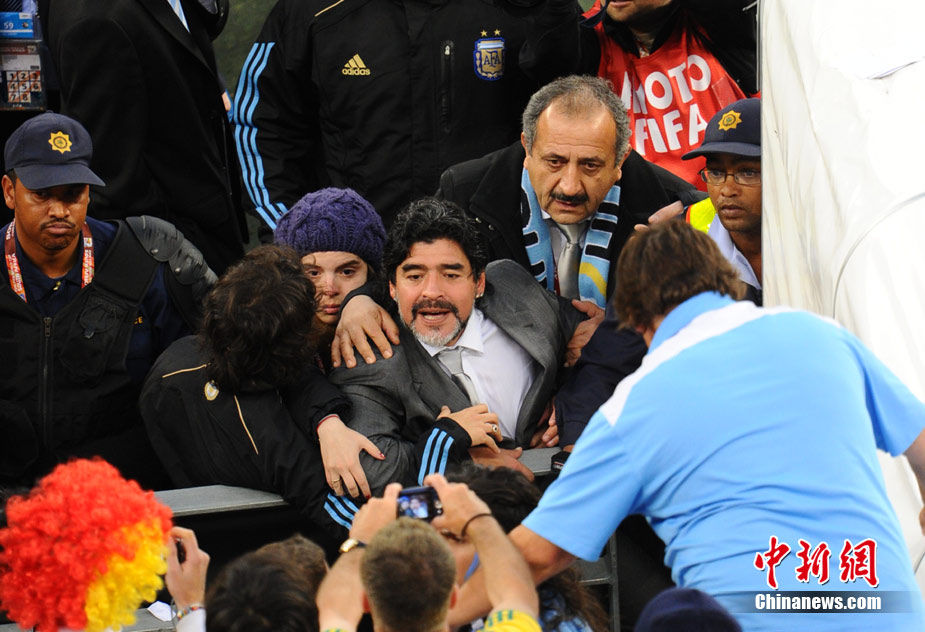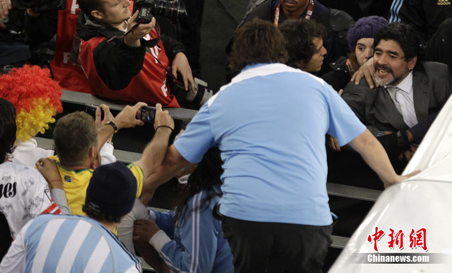 南非世界杯阿根廷與德國隊的比賽結(jié)束后,瘋狂的德國球迷對馬拉多納進行了辱罵和奚落,急脾氣的老馬轉(zhuǎn)身沖向看臺與球迷理論,他更是要爬上看臺親手教訓(xùn)這些球迷。好在大女兒達(dá)爾瑪和阿根廷教練組成員及時前往制止,否則后果將不堪設(shè)想。