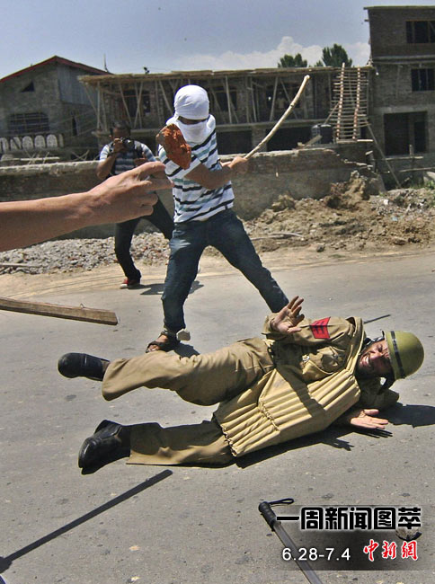 28日(周一),在印控克什米爾地區(qū)首府斯利那加市郊,當(dāng)?shù)啬滤沽衷谂e行抗議活動(dòng)時(shí)與警察發(fā)生沖突,兩名穆斯林在沖突中喪生。圖為警察在沖突中被打倒在地。