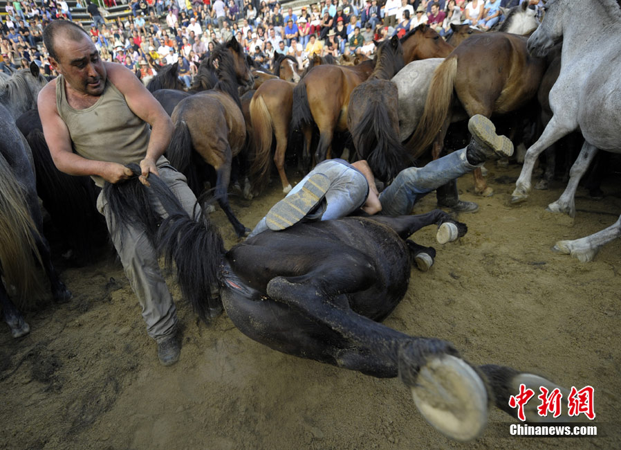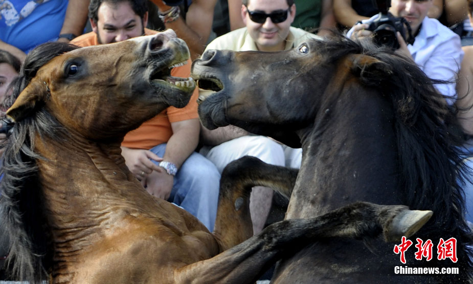 當?shù)貢r間7月3日,西班牙薩武塞多,年輕人在傳統(tǒng)的“捕野馬節(jié)”上馴服野馬。作為古老的加利西亞節(jié)日,捕野馬節(jié)可以追溯到青銅時代的馴獸練習(xí)。