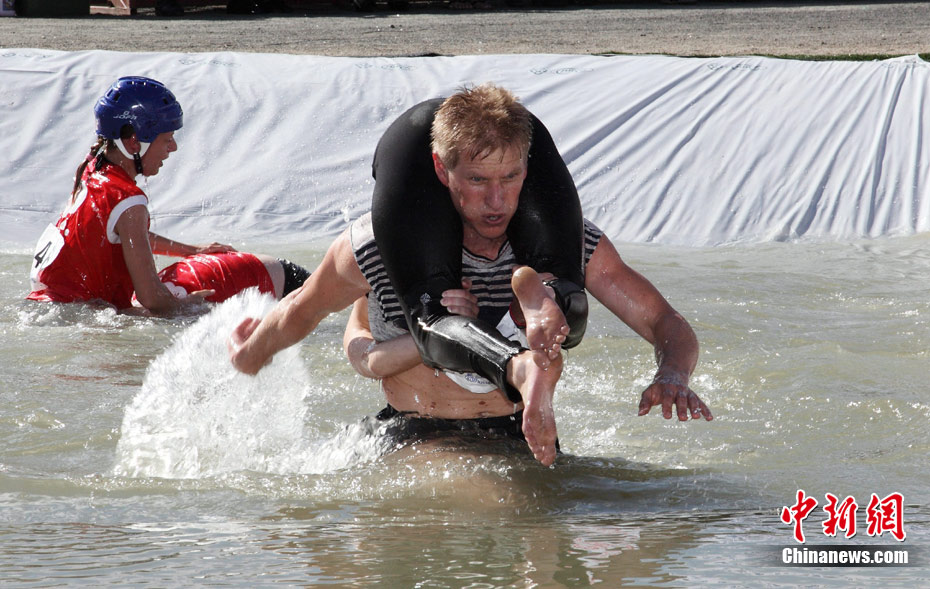 7月3日,一年的一度的世界背老婆大賽在芬蘭中部小鎮(zhèn)松卡耶爾維舉行,參賽者背著自己的老婆在泳池里行走,最終來(lái)自芬蘭的一對(duì)選手最先通過(guò)終點(diǎn)。