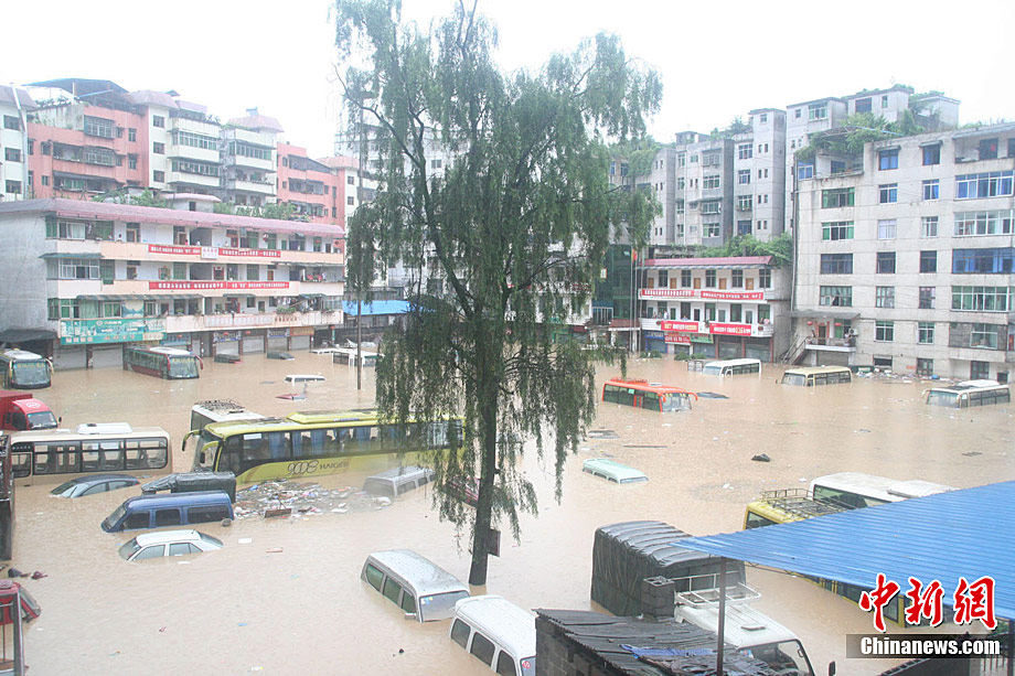 7月9日,重慶酉陽縣城一個停車場被洪水淹沒。8日21時開始,重慶市酉陽縣各地出現(xiàn)今年入汛以來最強降水,導致該縣眾多地勢較低洼地方被淹。截至9日8時,該縣平均降水量達151.4毫米,目前當?shù)亟涤耆栽诔掷m(xù)。中新社發(fā) 黃勝華 攝