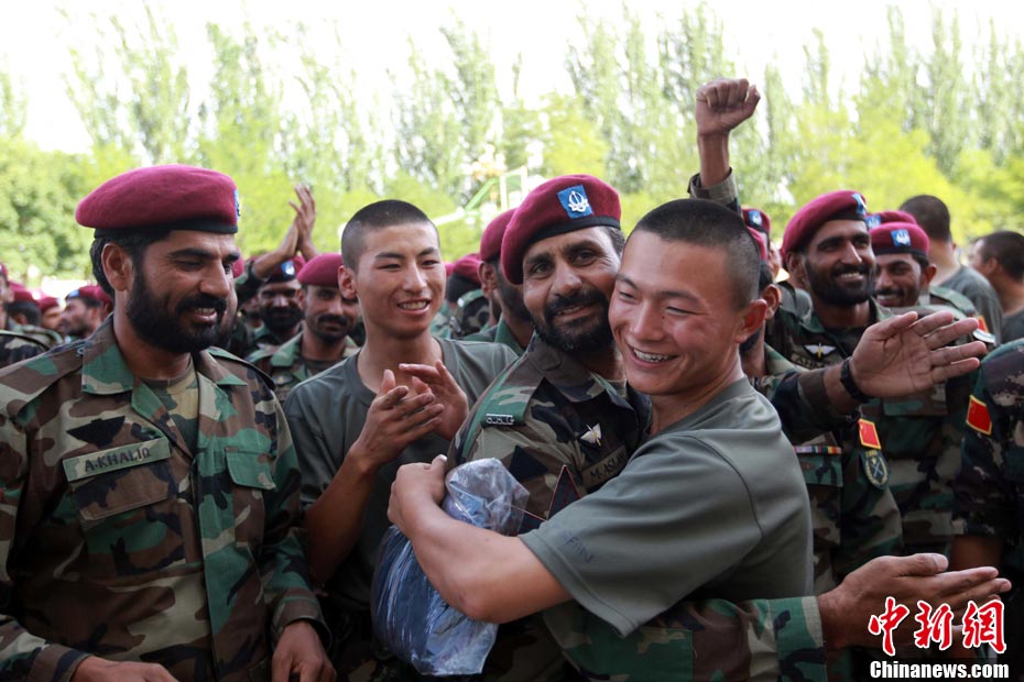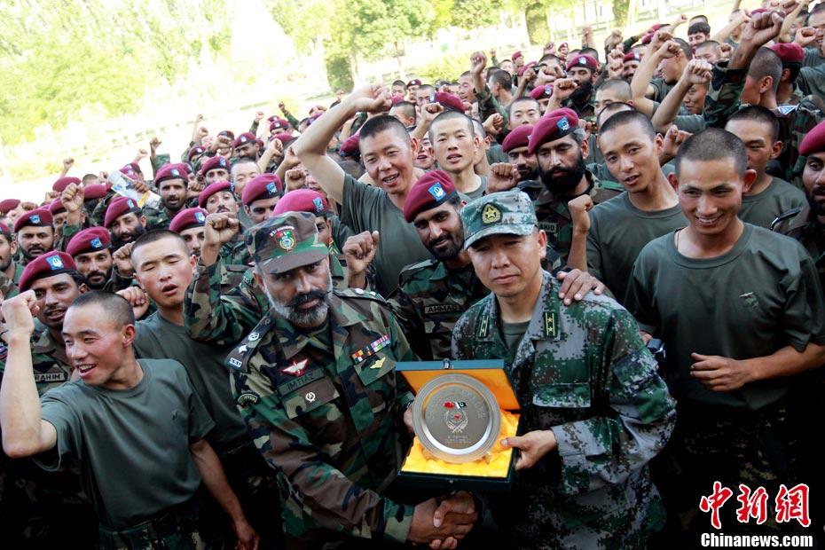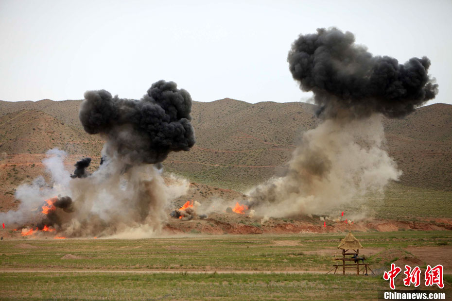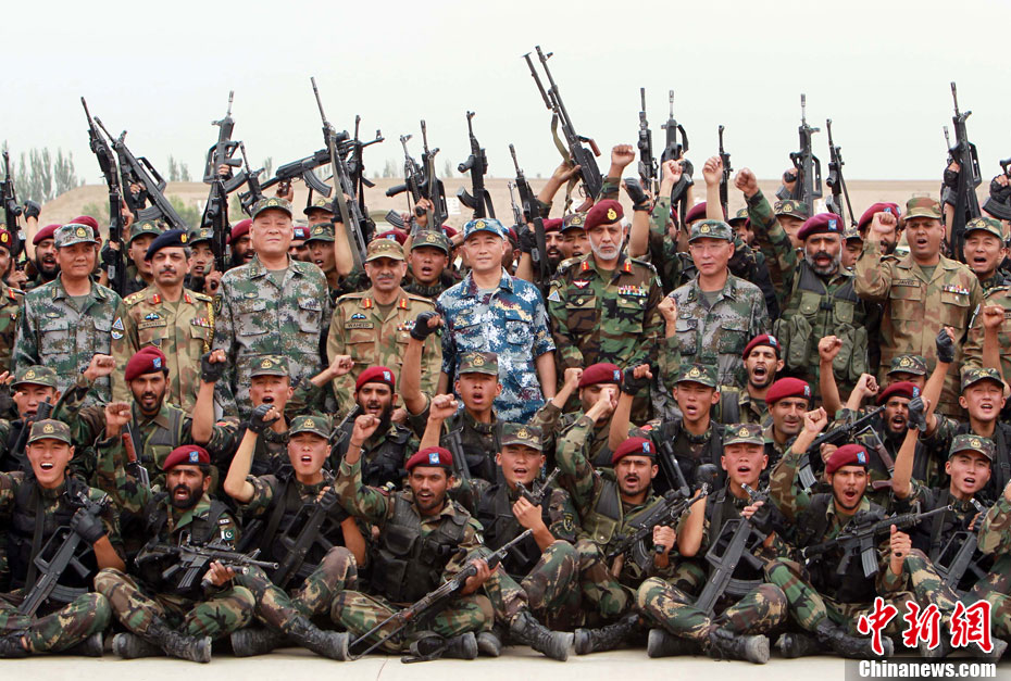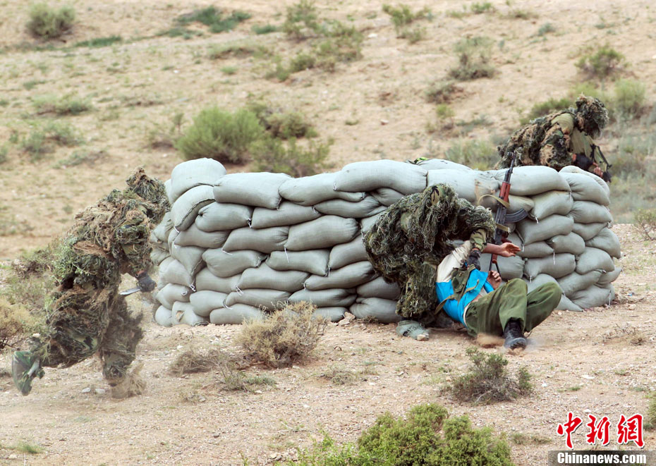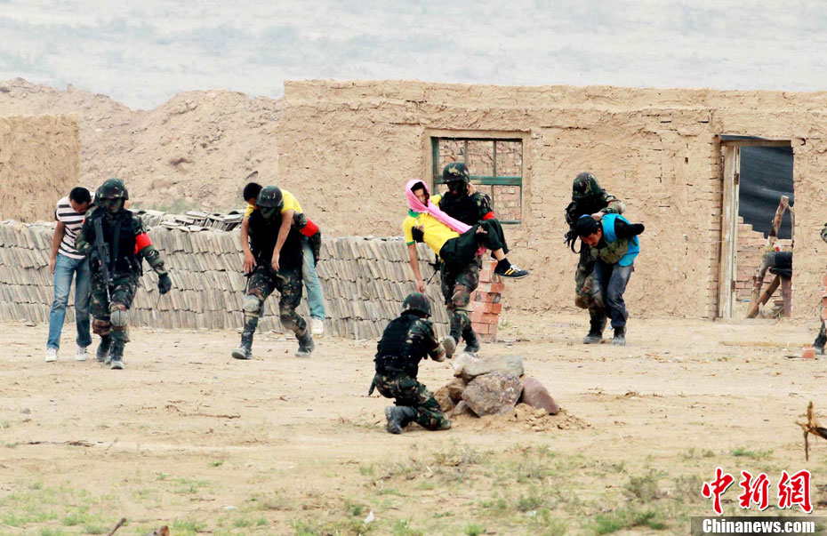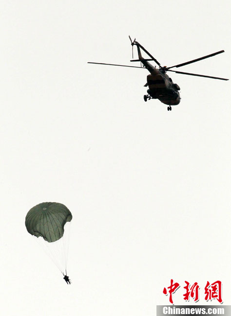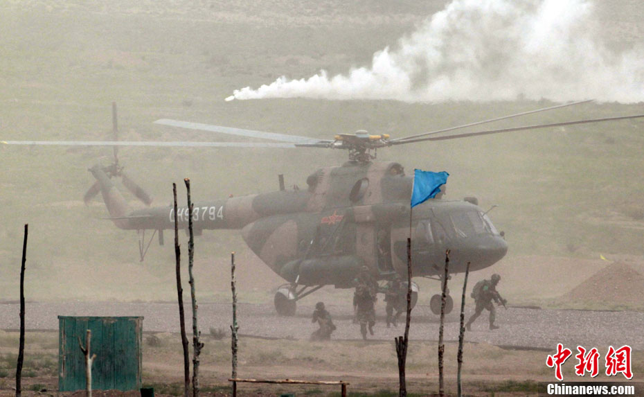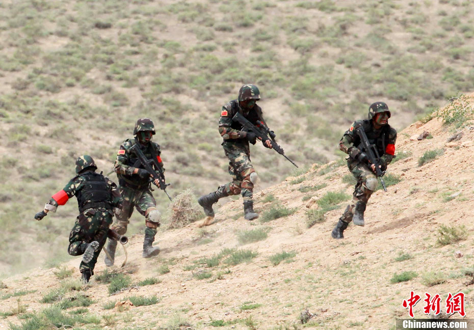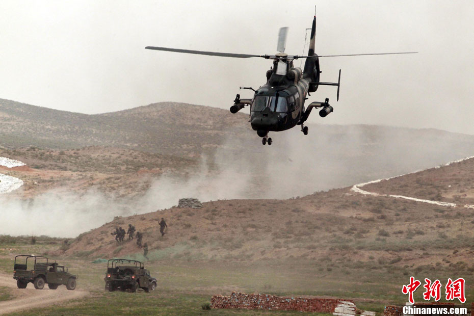 7月9日,友誼-2010”中巴反恐聯(lián)訓(xùn)在蘭州軍區(qū)某訓(xùn)練基地舉行實(shí)兵實(shí)彈演練,演練設(shè)計(jì)的背景是,對潛入中巴邊境地區(qū)實(shí)施襲擊破壞的國際恐怖分子進(jìn)行聯(lián)合打擊。圍繞“邊境地區(qū)山地聯(lián)合反恐作戰(zhàn)”這一課題,演練了遠(yuǎn)程投送、偵察監(jiān)視、立體封控、精確打擊、解救人質(zhì)、搜剿圍殲6個(gè)行動(dòng)。這次反恐聯(lián)演的一個(gè)亮點(diǎn),就是首次空地協(xié)同,聯(lián)合打擊,由地面反恐特戰(zhàn)人員引導(dǎo)殲轟機(jī)、武裝直升機(jī)實(shí)施空中火力突擊,采取精打要害的戰(zhàn)法,以建制內(nèi)的火器對恐怖分子營地重要目標(biāo)實(shí)施火力打擊。中新社發(fā) 杜洋 攝