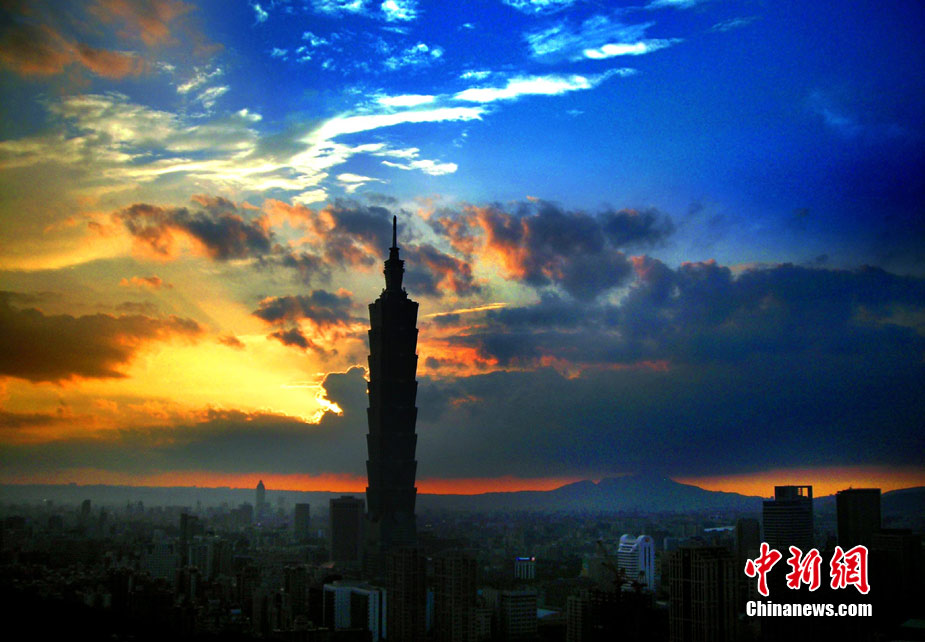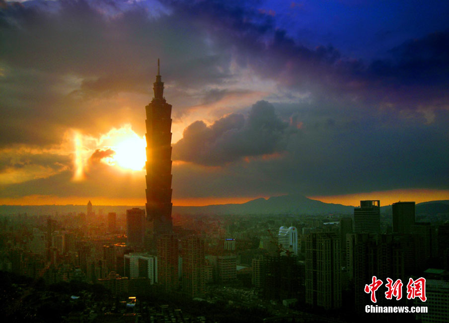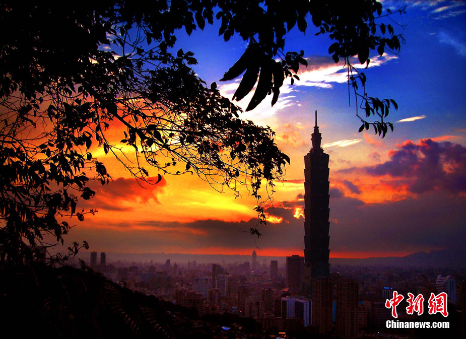 7月15日傍晚,臺北市一陣電閃雷鳴過后,太空霞光四射,從象山俯瞰市區(qū),101摩天大樓聳入云霄,景觀如畫。美麗的臺北市地處盆地,氣候多變,夏季的城市景色也時常變幻莫測。中新社記者 宋吉河 攝