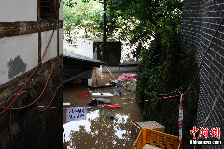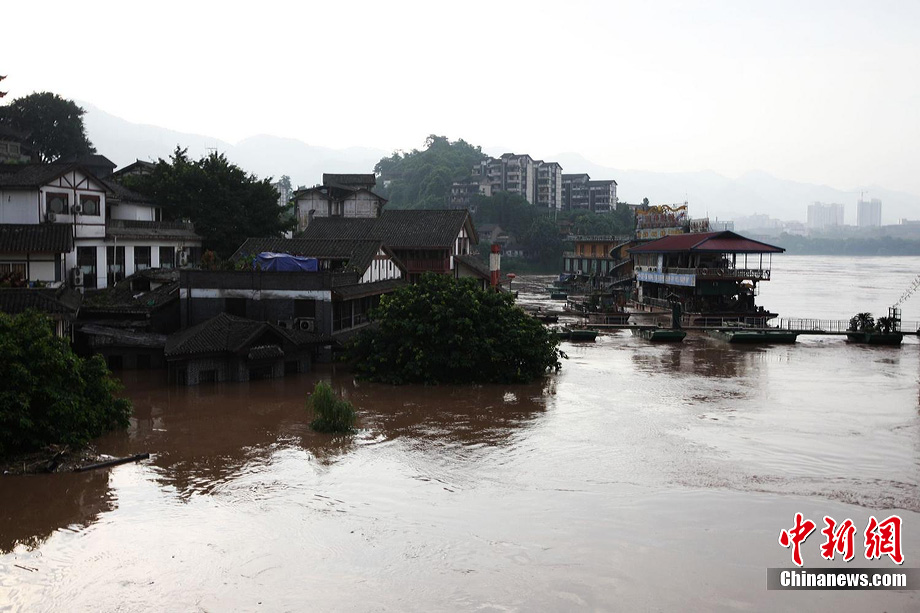 7月19日,今年入汛以來最大洪峰經(jīng)過重慶主城,長江、嘉陵江水位上漲。記者在重慶古鎮(zhèn)磁器口看到,從磁器口江邊至磁器口街道的梯坎已“隱”于水面下,標(biāo)志性牌匾龍隱門沒至“腰部”,靠近江邊的商鋪及民居被淹。目前,大部分商家、市民接預(yù)警已提前撤場歇業(yè)或撤離至安全地帶。截至記者趕赴磁器口途中,部分必經(jīng)路段已實(shí)施交通管制,磁器口正街漲水期間亦采取禁行措施。據(jù)長江水利委員會水文局監(jiān)測數(shù)據(jù),19日20時長江重慶寸灘站水位超過185米,這是重慶遭遇的長江今年以來最大洪峰。截至20日0時,長江重慶水位仍在185.06米的峰值上流動,洪峰仍在過境重慶。 劉函冉 攝