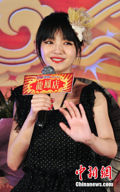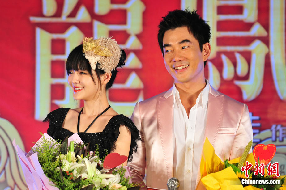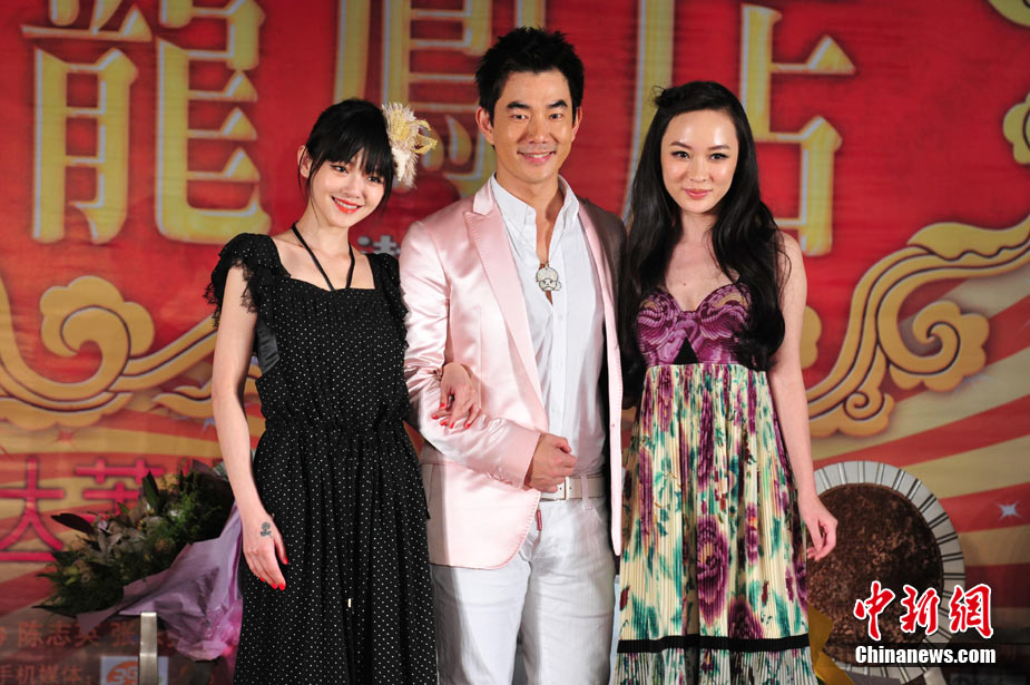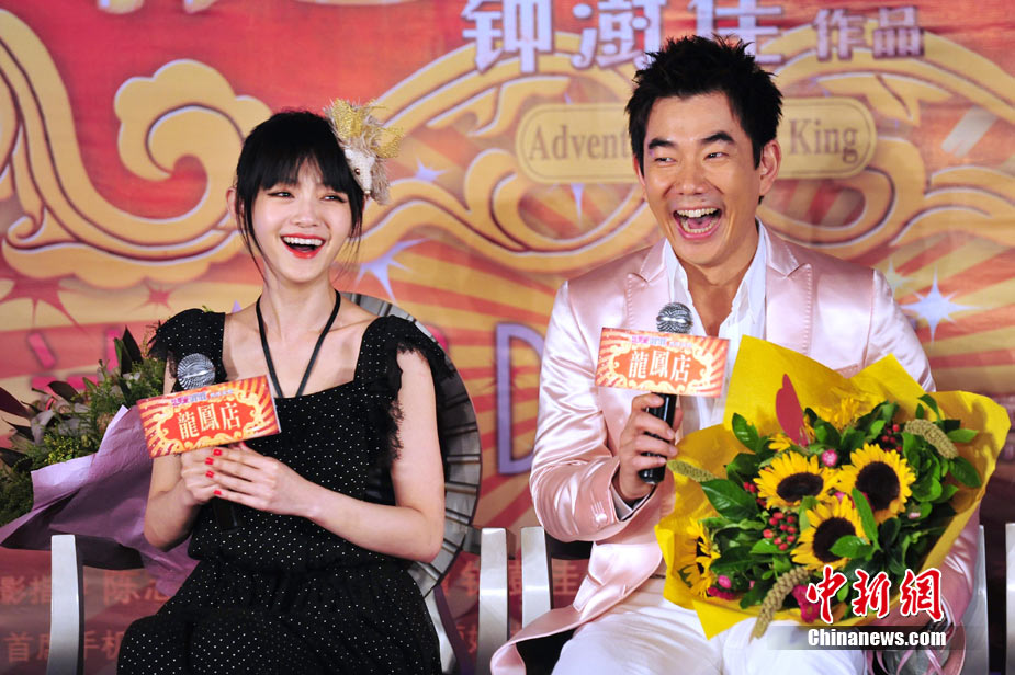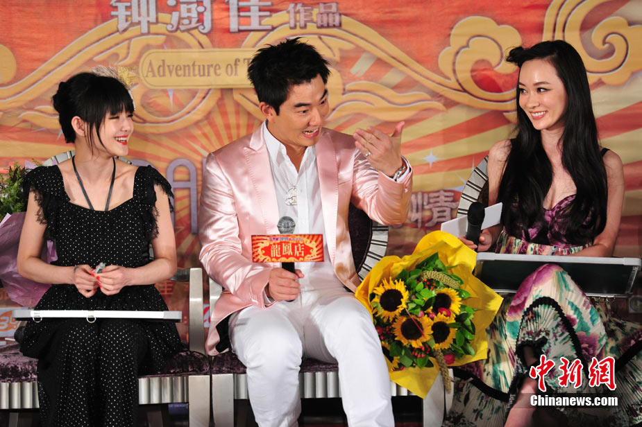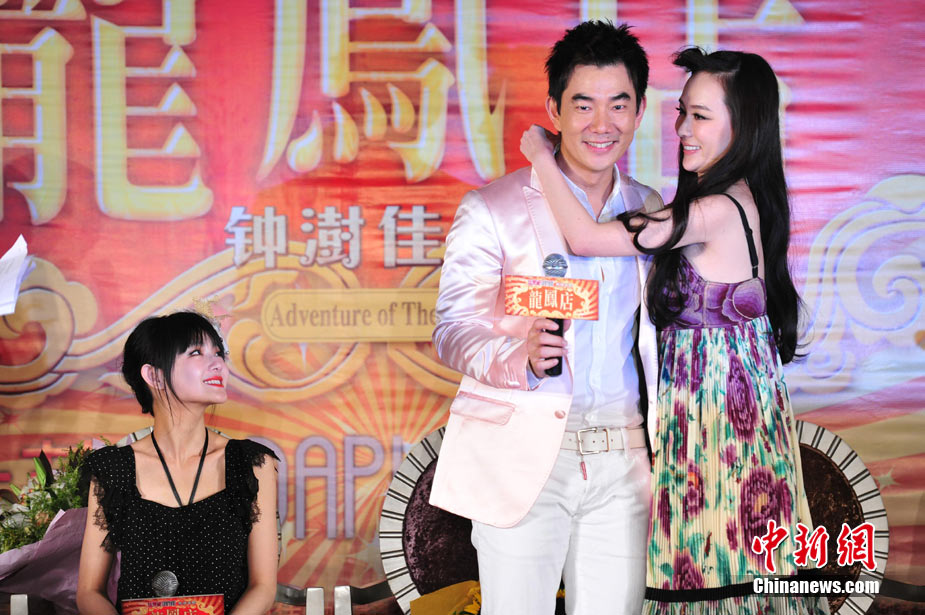 7月30日,古裝愛情喜劇《龍鳳店》在京舉辦官網(wǎng)啟動暨終極海報揭幕發(fā)布會,導演鐘澍佳攜主演任賢齊、大S、霍思燕亮相,臺灣著名音樂人小蟲前來助陣。大S頭戴“刺猬”發(fā)卡可愛亮相,與任賢齊在現(xiàn)場大談對唱《龍鳳店》主題曲的感受,大S笑稱唱歌比小S好聽。后來登臺的霍思燕卻大搶大S風頭,她為任賢齊親手戴上禮物項鏈,還親密擁抱久久對視,兩人在現(xiàn)場大秀親昵立刻成為眾人矚目焦點,讓大S在一旁有點沒事做。中新社記者 李學仕攝