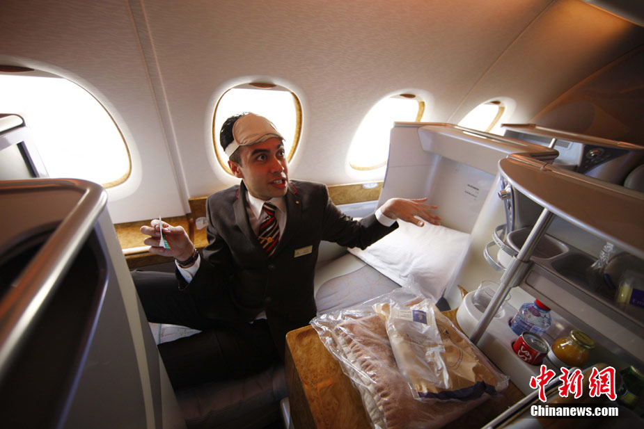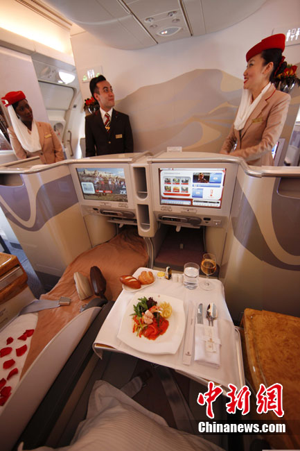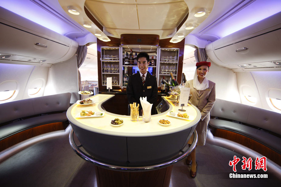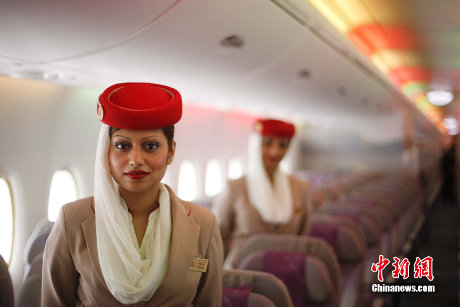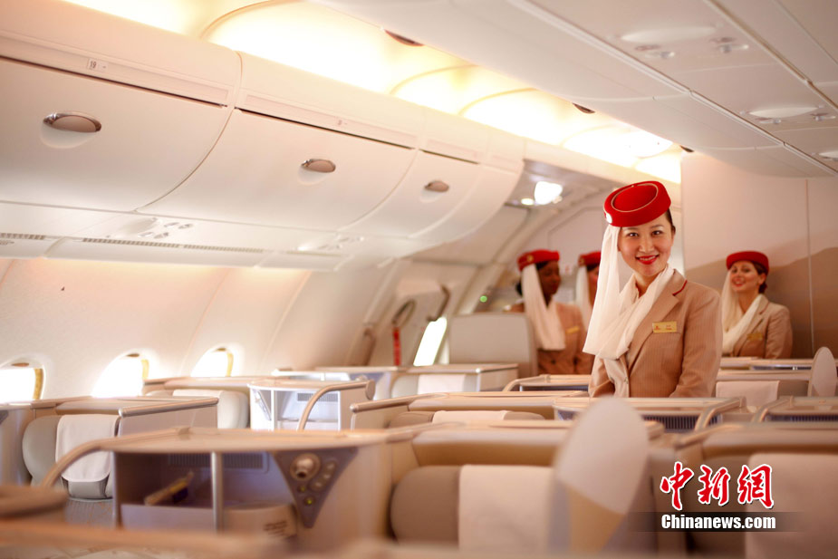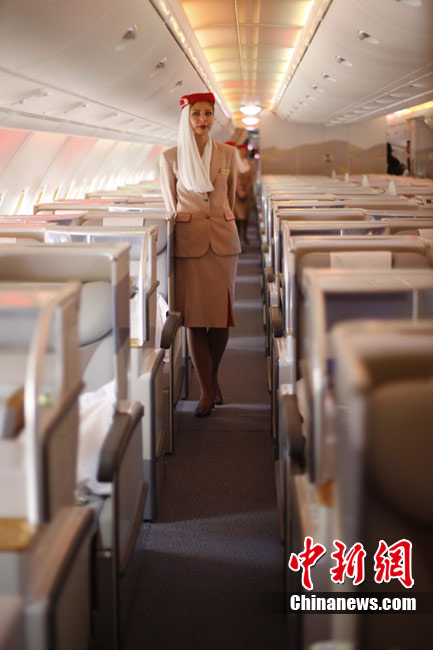 阿航A380 客機(jī)頭等艙內(nèi)共有14個私人套間,設(shè)有兩間設(shè)備齊全的淋浴房,帶按摩功能的座椅可平躺成床。頭等艙和商務(wù)艙乘客還能享受如私人會所般、提供冷熱小點和酒品飲料的機(jī)上酒廊社交區(qū)。商務(wù)艙的座椅可放平成2米長的床,而經(jīng)濟(jì)艙的座椅可以傾斜多達(dá)33英寸,讓乘客自由舒展身體。所有艙位的乘客都可以享用阿航多達(dá)1200個頻道的數(shù)碼寬屏機(jī)上娛樂系統(tǒng),該系統(tǒng)提供空中娛樂節(jié)目。圖為阿聯(lián)酋航空空客A380上的空姐。中新社記者 盛佳鵬 攝