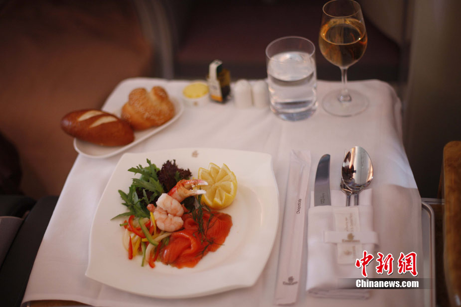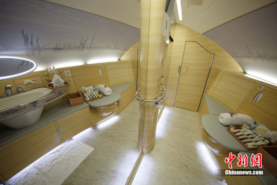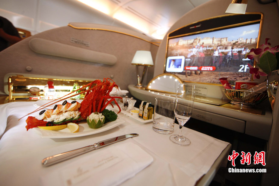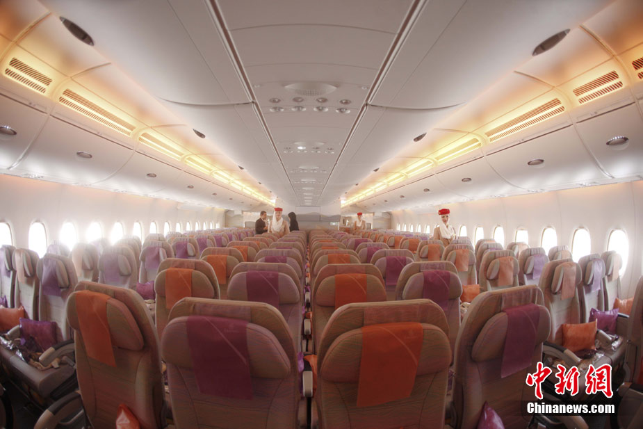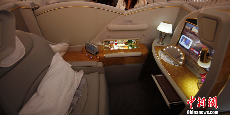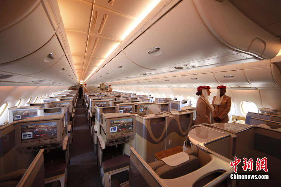 阿航A380 客機(jī)頭等艙內(nèi)共有14個私人套間,設(shè)有兩間設(shè)備齊全的淋浴房,帶按摩功能的座椅可平躺成床。頭等艙和商務(wù)艙乘客還能享受如私人會所般、提供冷熱小點和酒品飲料的機(jī)上酒廊社交區(qū)。商務(wù)艙的座椅可放平成2米長的床,而經(jīng)濟(jì)艙的座椅可以傾斜多達(dá)33英寸,讓乘客自由舒展身體。所有艙位的乘客都可以享用阿航多達(dá)1200個頻道的數(shù)碼寬屏機(jī)上娛樂系統(tǒng),該系統(tǒng)提供空中娛樂節(jié)目。圖為阿聯(lián)酋航空空客A380上的空姐。中新社記者 盛佳鵬 攝