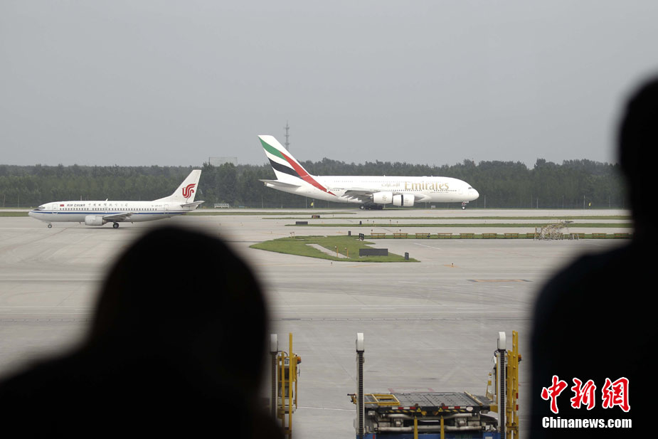 8月1日,阿聯(lián)酋航空公司A380飛機(jī)降落在北京首都機(jī)場,這是世界上最大客機(jī)A380執(zhí)行的首條定期飛北京的航線?湛虯380是世界上最環(huán)保的商業(yè)客機(jī),它的合成材料、輕身原料和加固構(gòu)架使其每座位燃油消耗比其他同類型飛機(jī)低20%以上。
