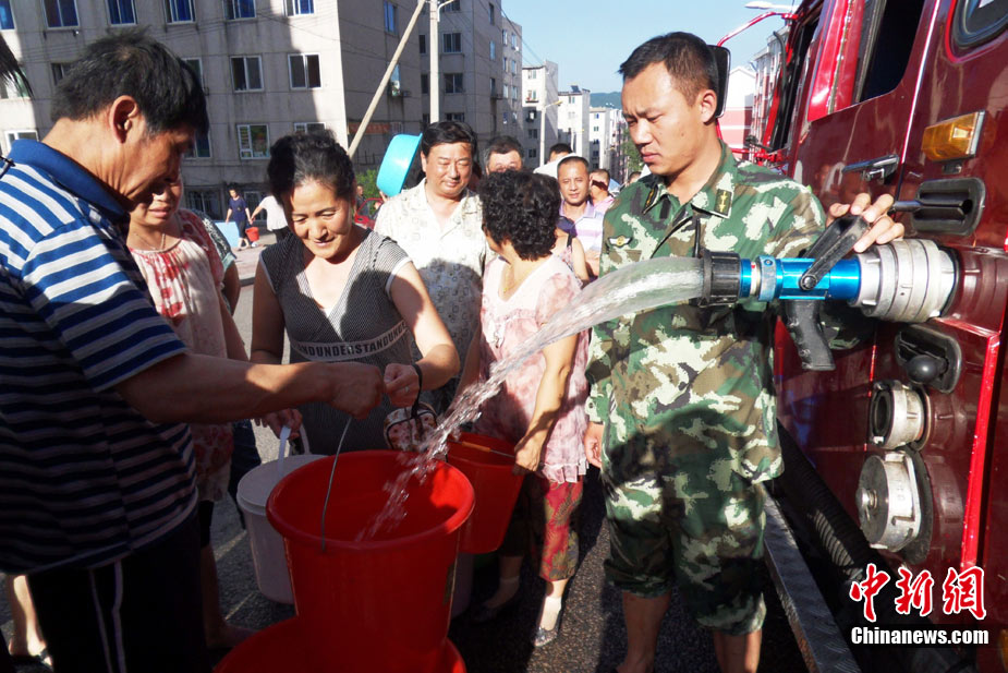 從7月31日吉林通化市內(nèi)全部供水管線被洪水沖毀到現(xiàn)在,33萬居民斷水時(shí)間已經(jīng)超過60小時(shí)。 8月3日通化市派出消防車輛給居民運(yùn)送生活用水的工作仍將繼續(xù),時(shí)間有望從早5點(diǎn)到晚六點(diǎn)延長(zhǎng)到晚8點(diǎn),送水量也不會(huì)少于180臺(tái)次、1700噸水。同時(shí),當(dāng)?shù)匦l(wèi)生防疫部門對(duì)使用自用水的飯店進(jìn)行了嚴(yán)格監(jiān)督、檢查和登記,目前,沒有發(fā)現(xiàn)水質(zhì)問題,也沒有食物中毒現(xiàn)象發(fā)生。中新社發(fā) 王孝偉 攝 來源:CNSPHOTO