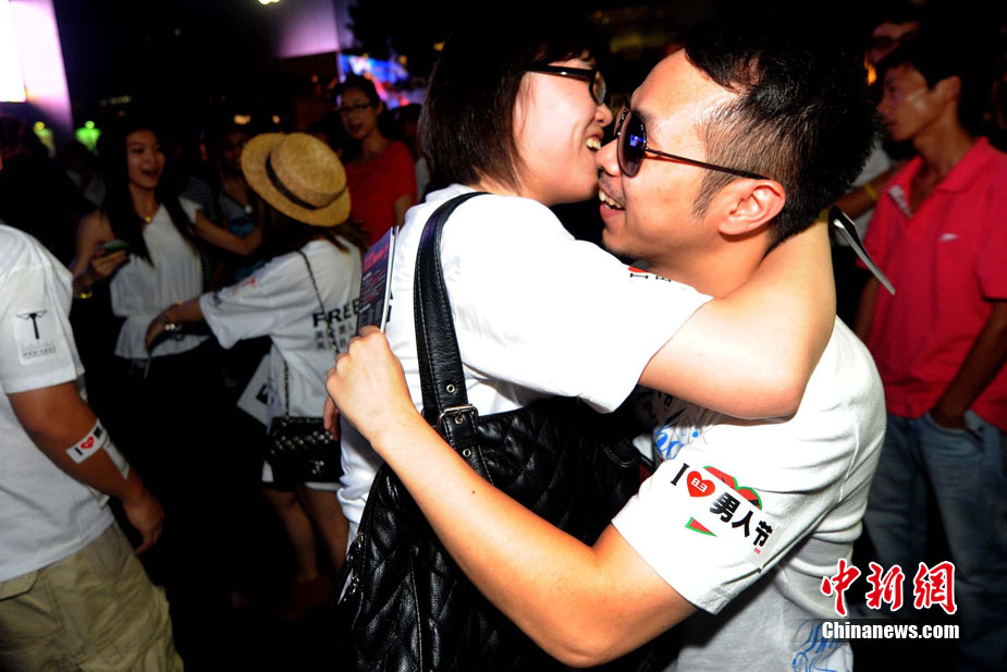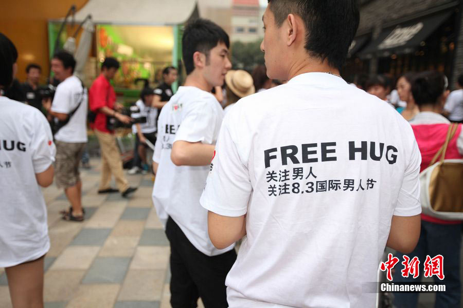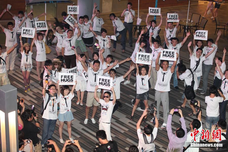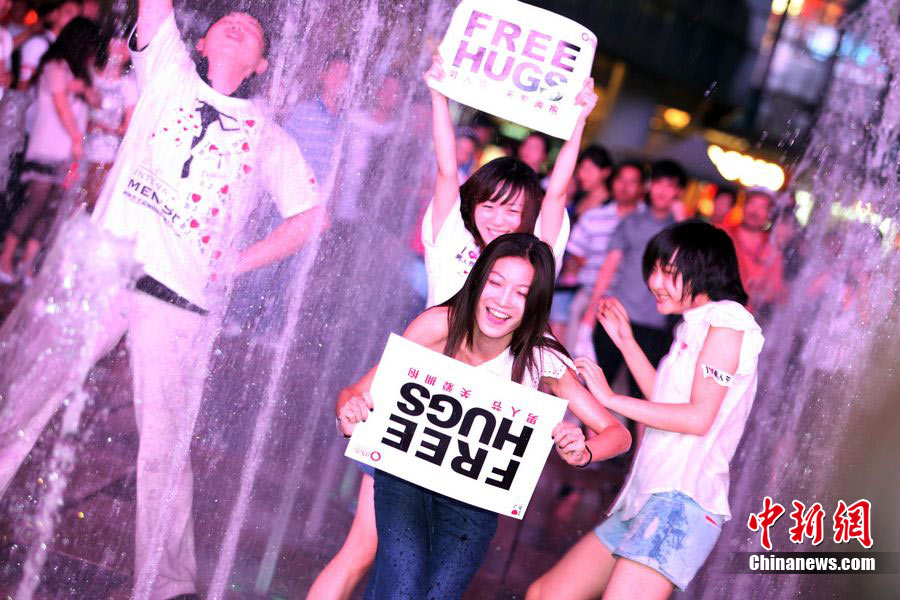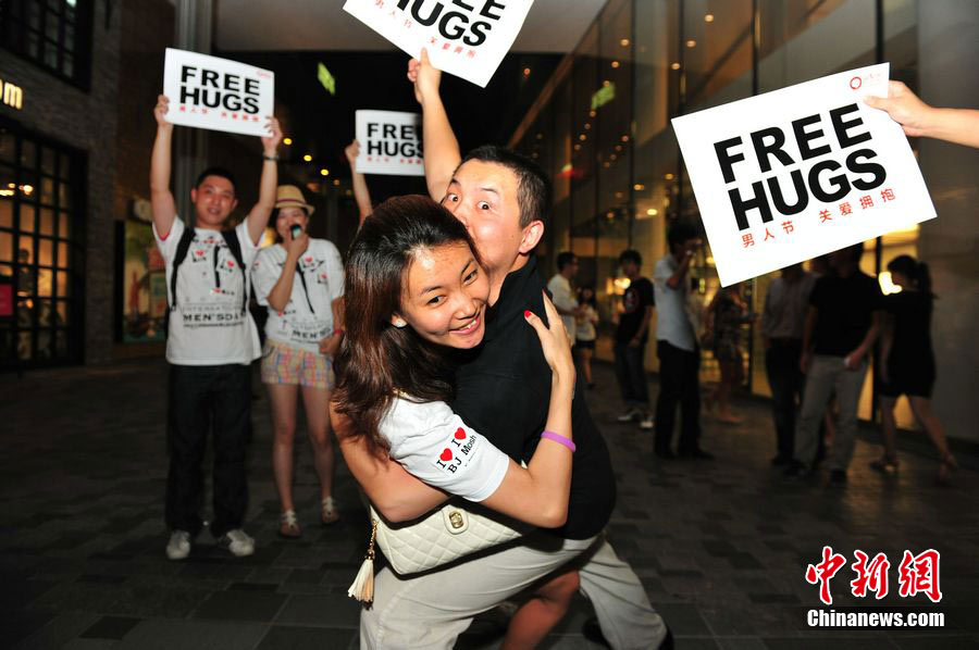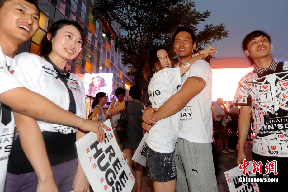 8月3日晚,在北京三里屯,俊男靚女們舉起Free Hug(免費(fèi)的擁抱)的大牌子,向陌生人們發(fā)起了自由擁抱的邀請(qǐng),現(xiàn)場千人不分男女老少相互擁抱致意。“Free Hug”活動(dòng)起源于歐美,是一種倡導(dǎo)關(guān)心和理解的交流方式。中新社發(fā) 李學(xué)仕 攝