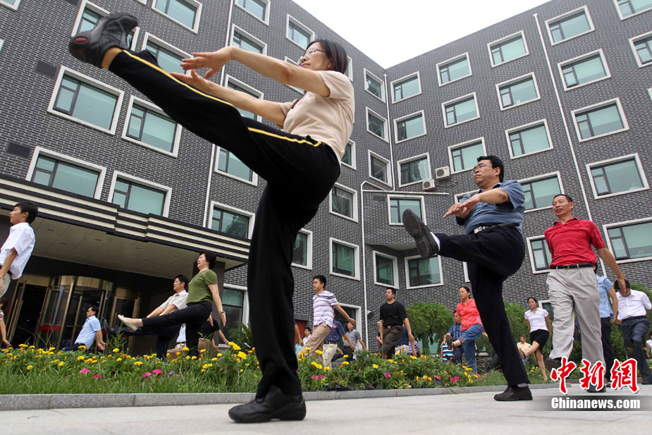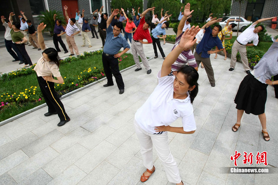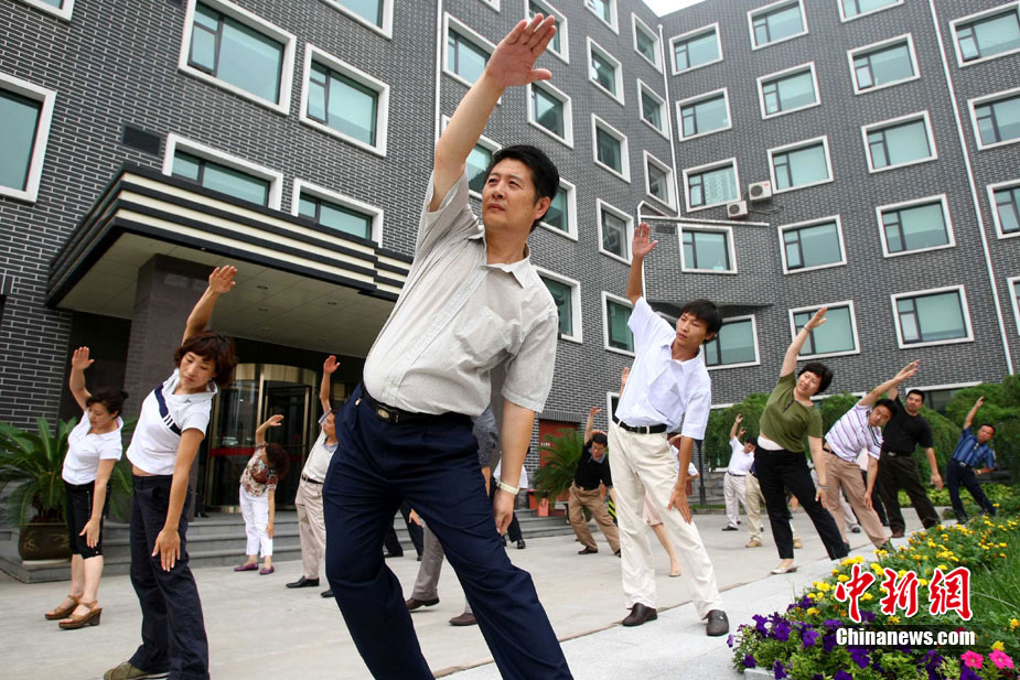 8月9日,北京化工集團(tuán)的職工在工間時(shí)段集體做廣播體操。當(dāng)日,北京恢復(fù)廣播體操,電臺(tái)在每天10時(shí)和15時(shí)連續(xù)播放兩次第八套廣播體操音樂(lè),時(shí)長(zhǎng)為8分鐘左右。此次,北京市總工會(huì)定下目標(biāo),2011年全市職工參與健身活動(dòng)比例要達(dá)到60%以上,國(guó)有企業(yè)參與工間或工前操活動(dòng)要達(dá)到100%,機(jī)關(guān)事業(yè)單位要達(dá)到70%。中新社發(fā) 富田 攝