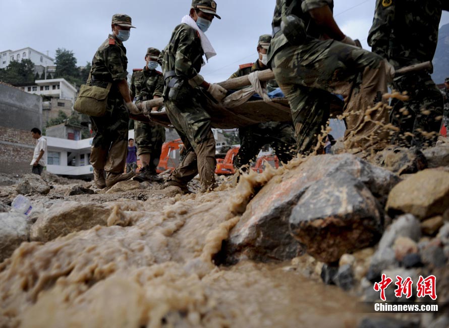 8月9日,甘肅舟曲泥石流災(zāi)區(qū)搜救進(jìn)入第二天。圖為消防官兵正在搜尋失蹤人員。中新社發(fā) 劉忠俊 攝