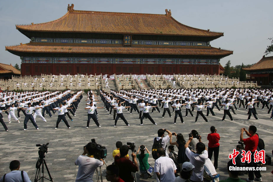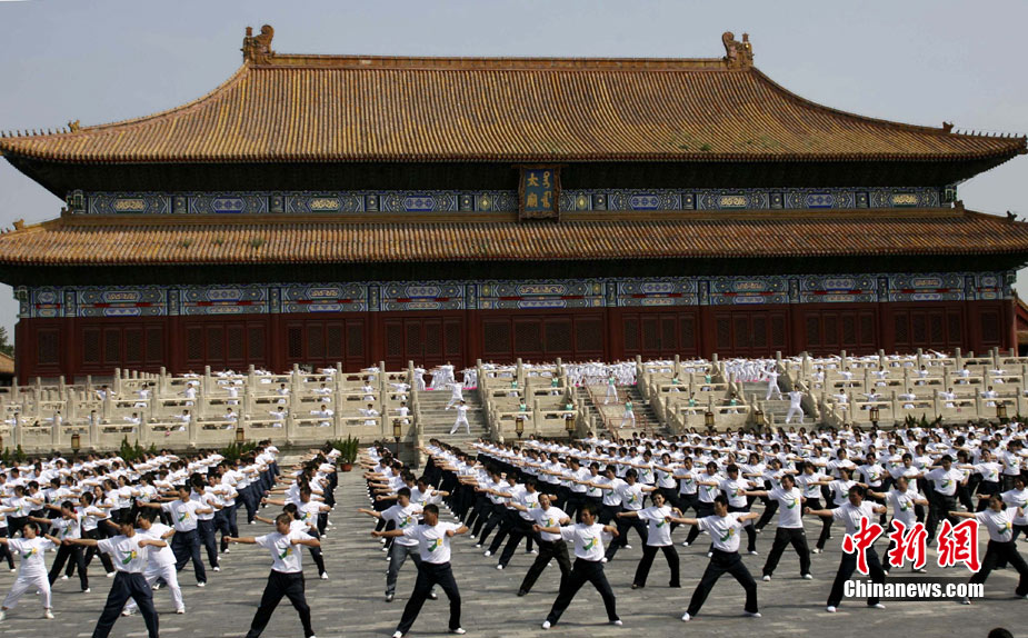 8月10日,北京50余個基層單位和表演團體的近3000余名職工工間操小教員在北京市勞動人民文化宮太廟前與副市長、體育明星和勞模們一起做“第八套廣播體操”。當日,2010首都職工示范推廣工間操宣傳周啟動。中新社發(fā) 蘇丹 攝