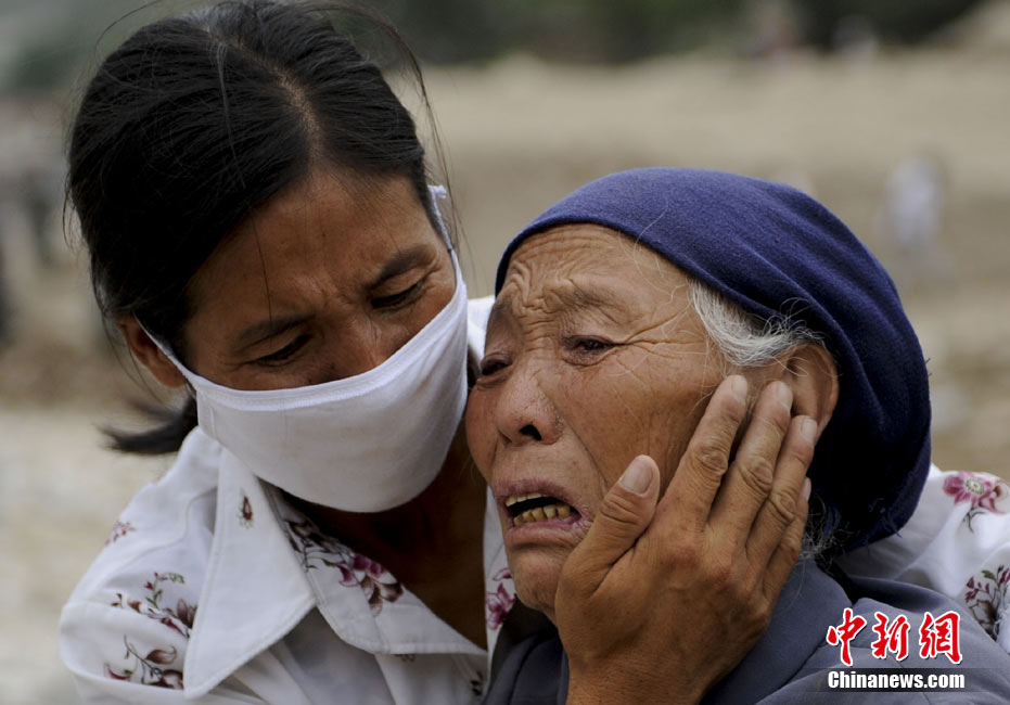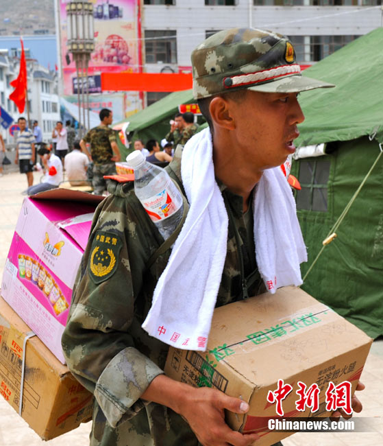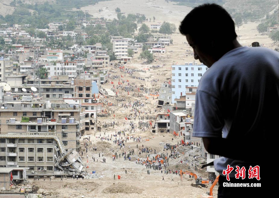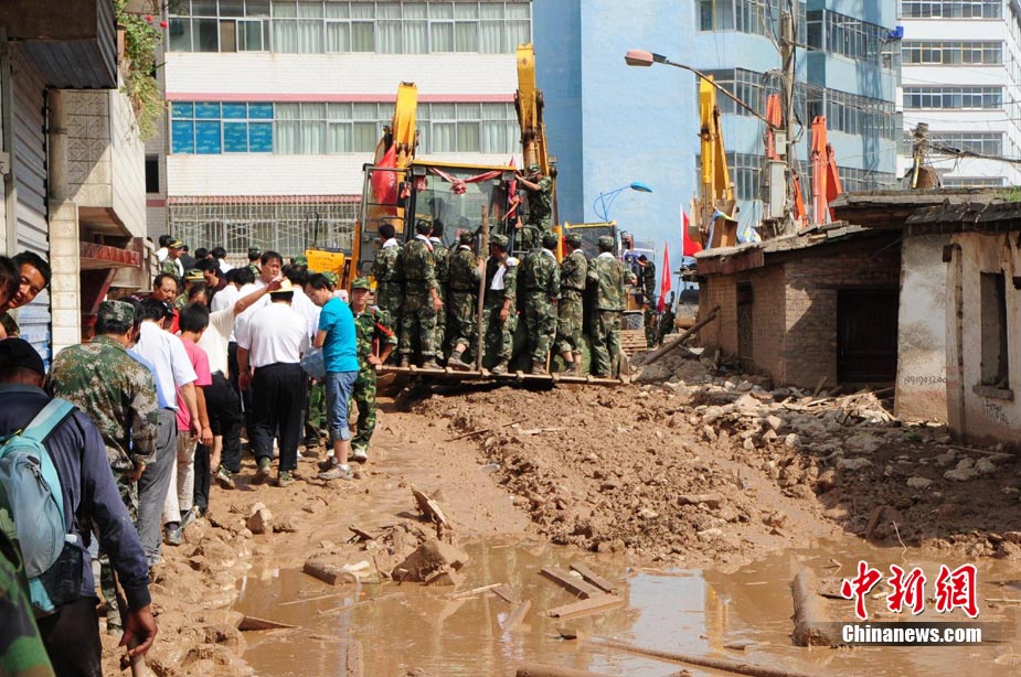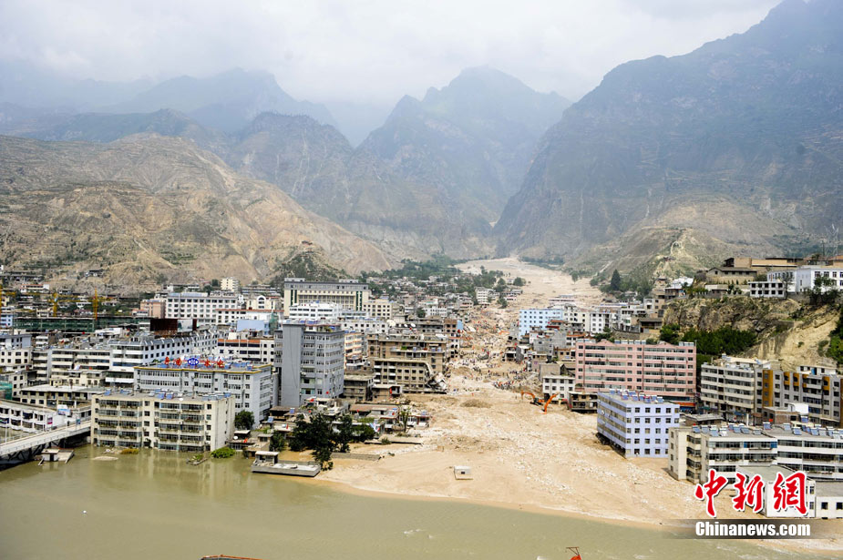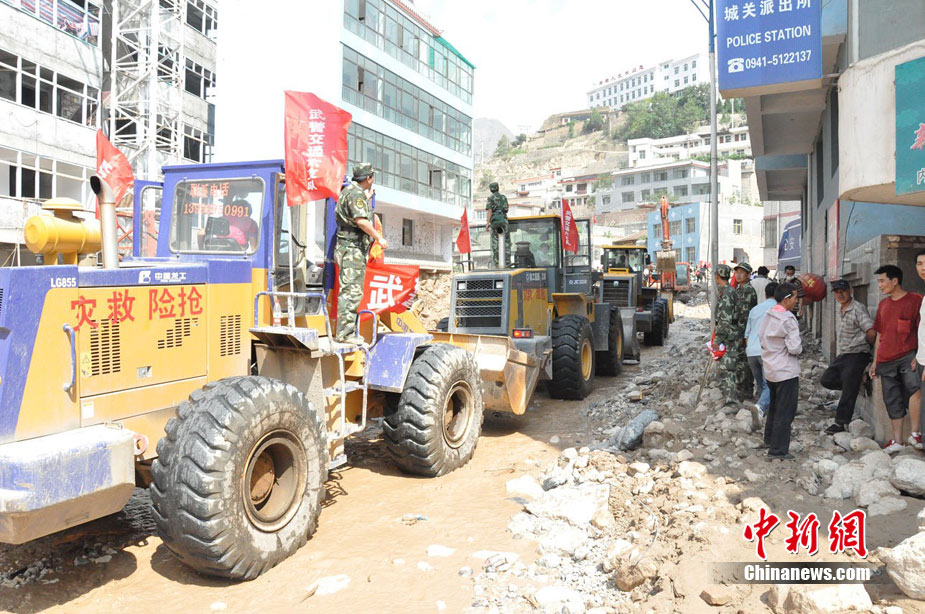 8月10日,甘肅舟曲泥石流災區(qū),蘭州軍區(qū)開山斧工兵團在泥石流造成的白龍江堰塞湖壩體上實施爆破。中新社發(fā) 廖攀 攝