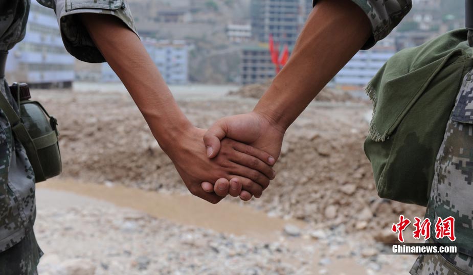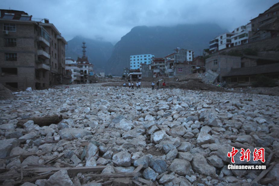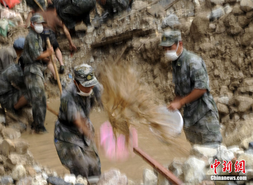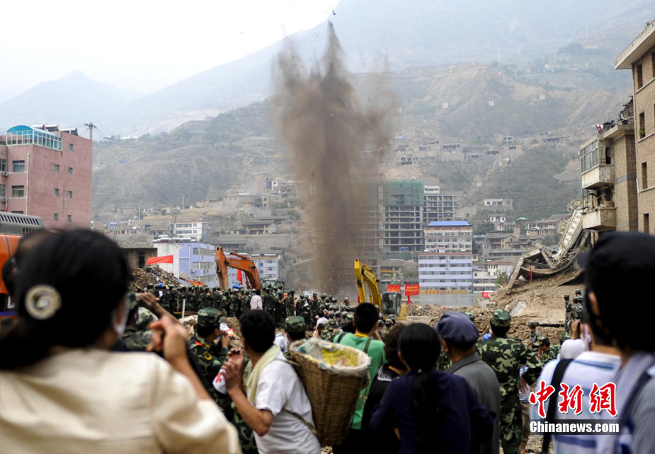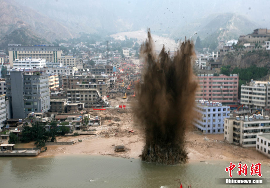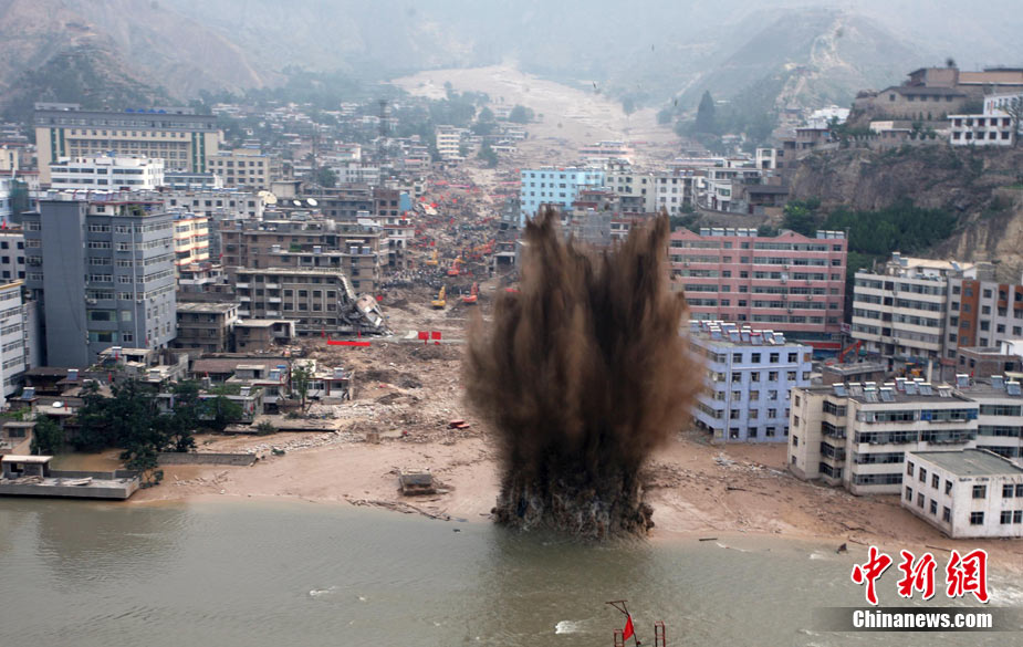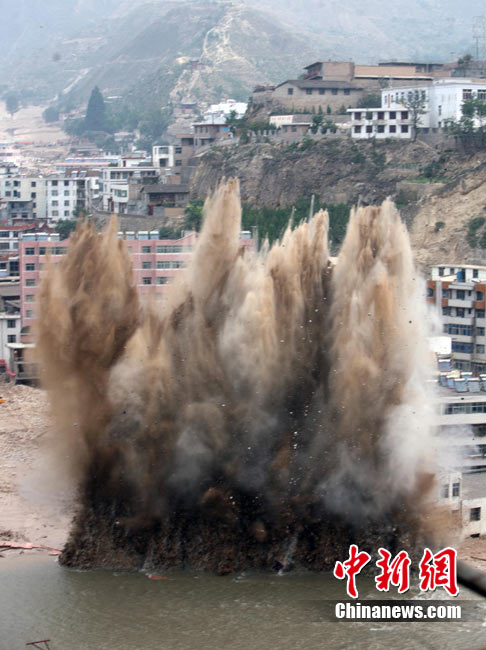 8月11日上午9時40分,蘭州軍區(qū)某集團(tuán)軍“開山斧工兵團(tuán)”對舟曲堰塞湖堰塞體成功實(shí)施第12次爆破。爆破后河道明顯出現(xiàn)斜坡,江水下泄速度明顯加快。圖為堰塞體12次爆破現(xiàn)場。中新社發(fā) 劉忠俊 攝