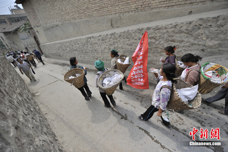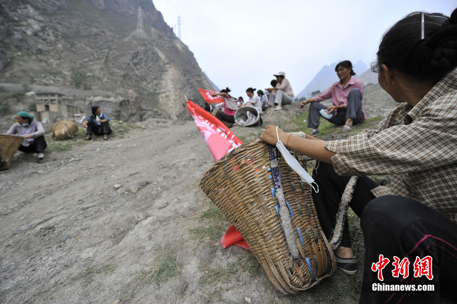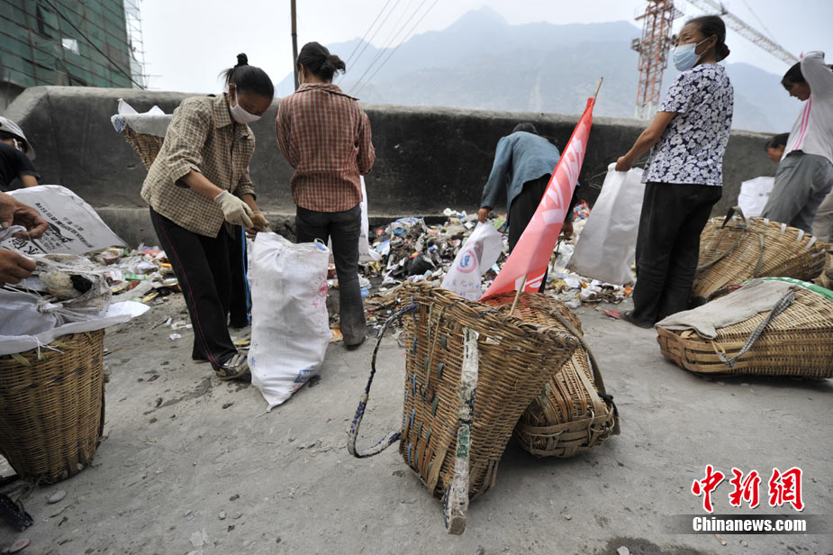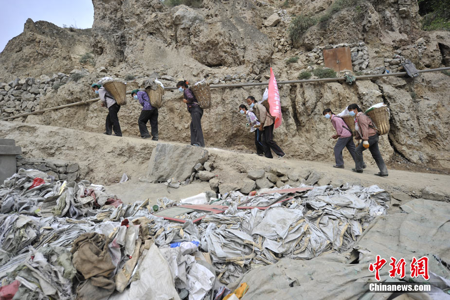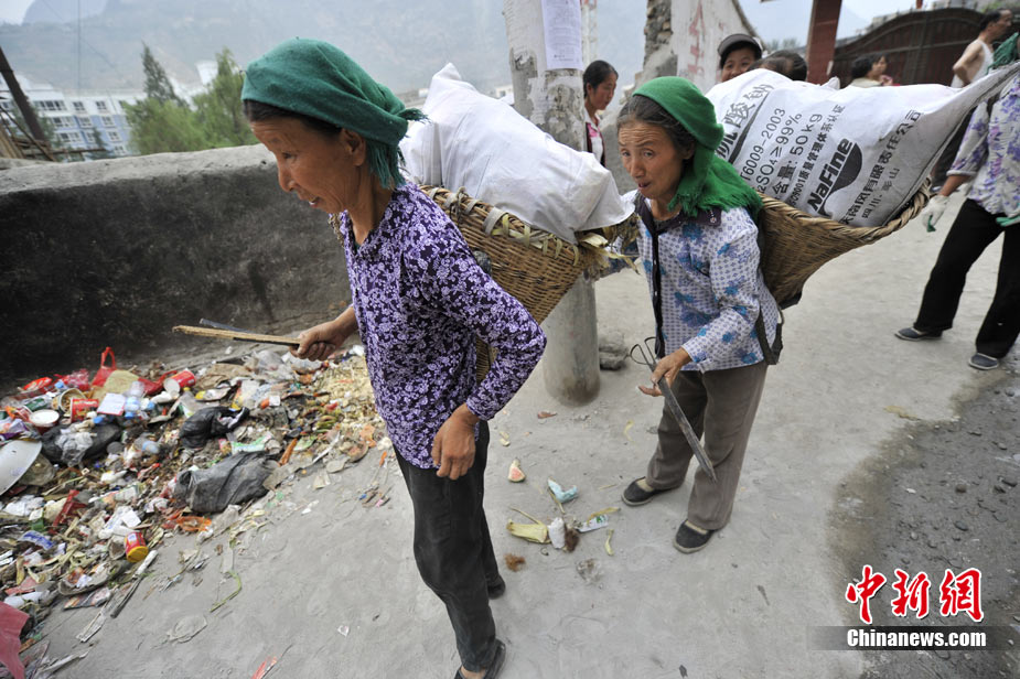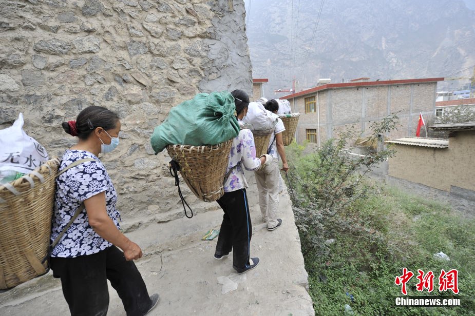 清晨8時許,舟曲鎖兒頭村的王旻桂和姐妹們來到城區(qū)。今天,她們的任務(wù)是將城區(qū)的生活垃圾清運出去。這是一支“背簍突擊隊”——“城區(qū)環(huán)境衛(wèi)生清理突擊隊”的旗幟在王旻桂的背簍上飄揚!氨澈t”這種當(dāng)?shù)卮迕裼脕戆徇\物品的日常工具,在救災(zāi)任務(wù)繁忙、交通不暢時,成為“利器”。