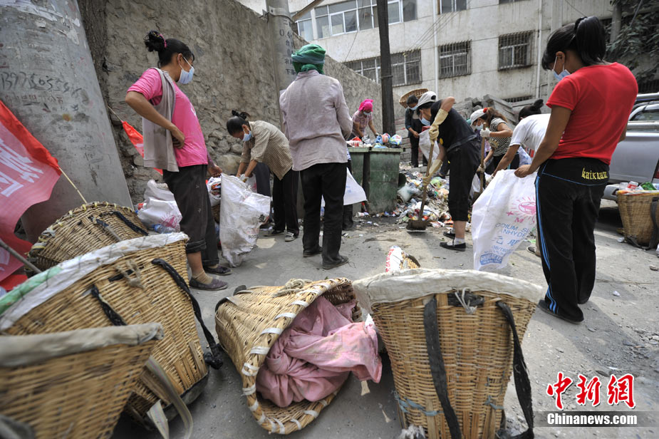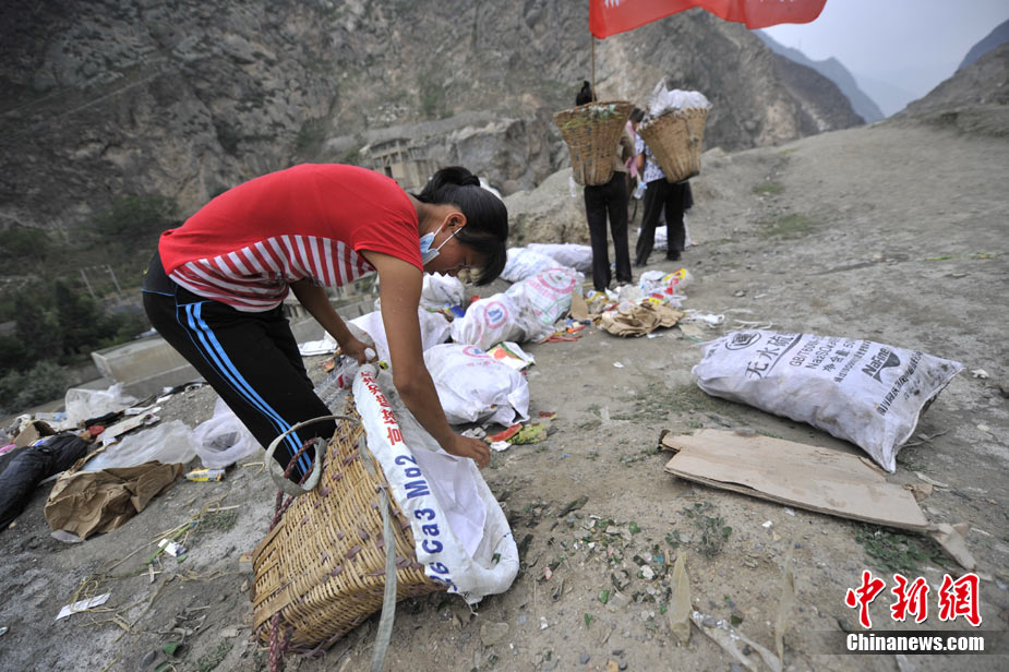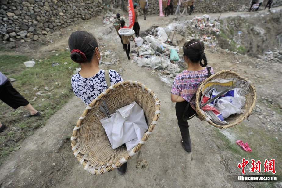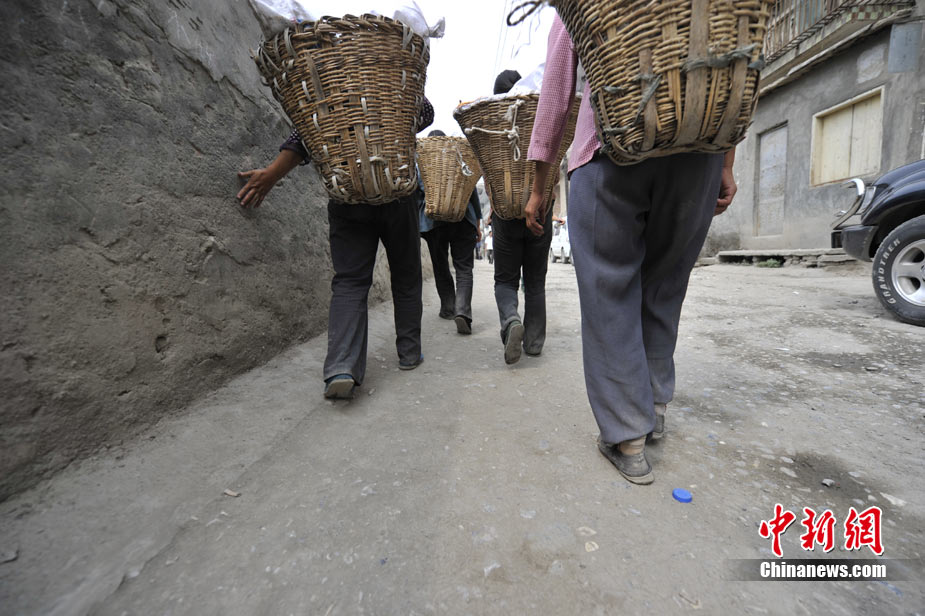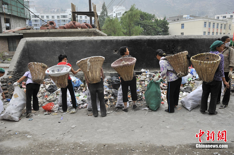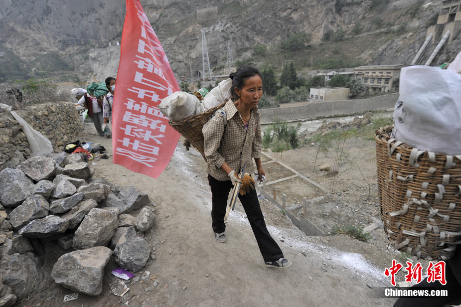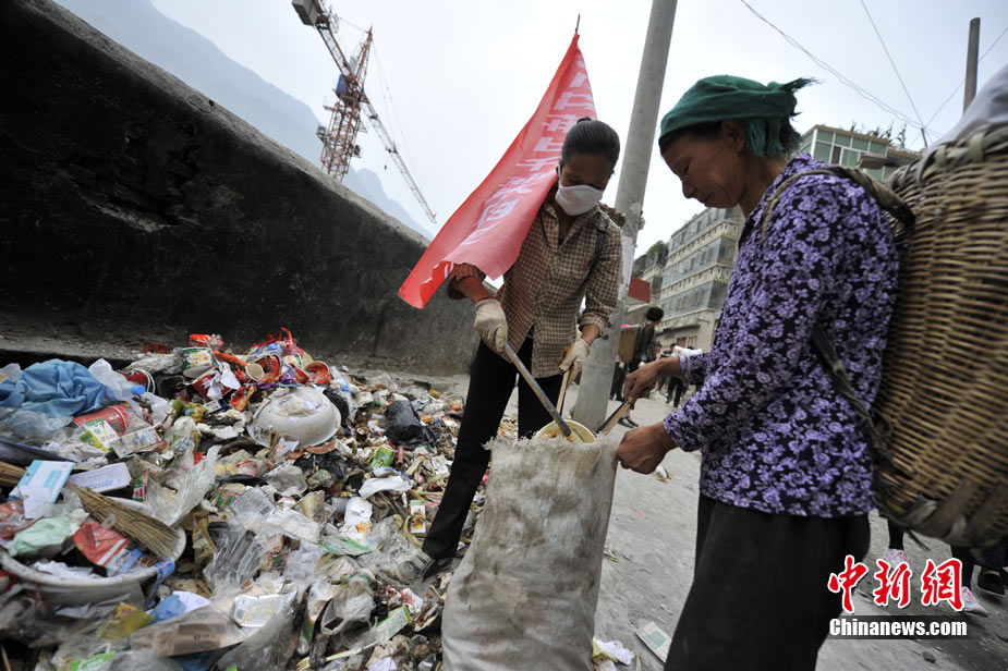 清晨8時許,舟曲鎖兒頭村的王旻桂和姐妹們來到城區(qū)。今天,她們的任務(wù)是將城區(qū)的生活垃圾清運出去。這是一支“背簍突擊隊”——“城區(qū)環(huán)境衛(wèi)生清理突擊隊”的旗幟在王旻桂的背簍上飄揚!氨澈t”這種當(dāng)?shù)卮迕裼脕戆徇\物品的日常工具,在救災(zāi)任務(wù)繁忙、交通不暢時,成為“利器”。