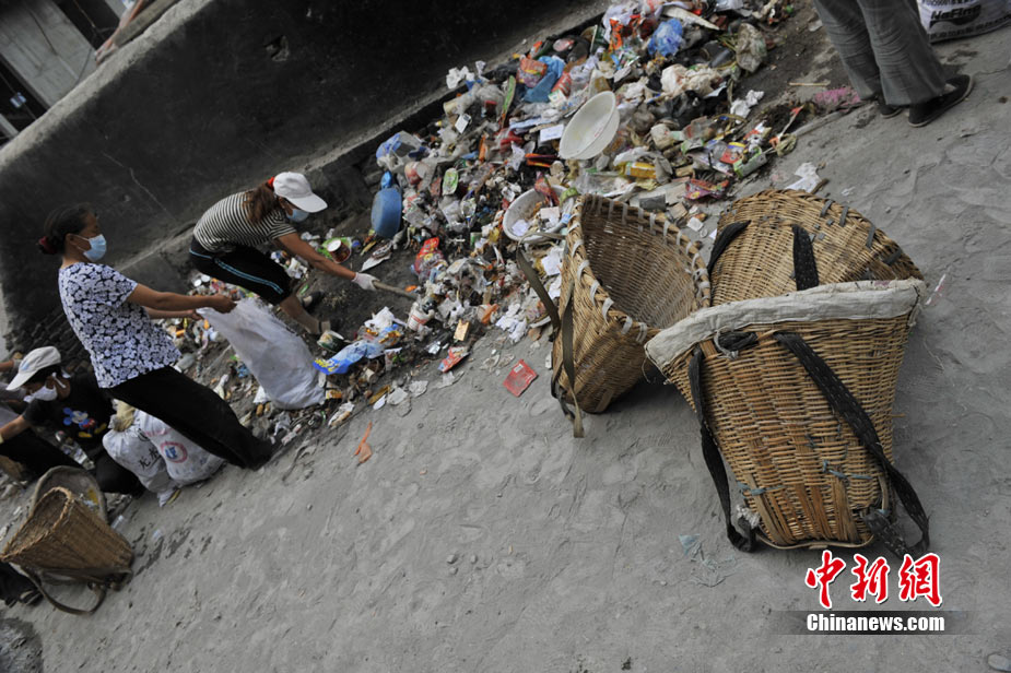 8點多,王旻桂和姐妹們裝起第一背簍垃圾,高高低低、曲曲折折、穿街走巷。城區(qū)中身著各種專業(yè)服裝、攜帶各種專業(yè)設(shè)備的救援隊來來往往。而這支“低調(diào)”的“突擊隊”還是引人側(cè)目。