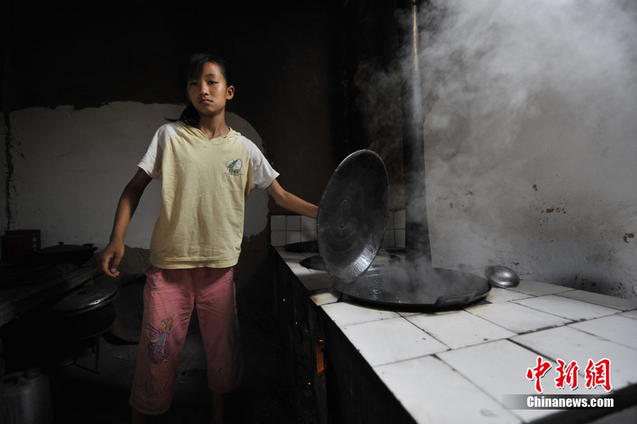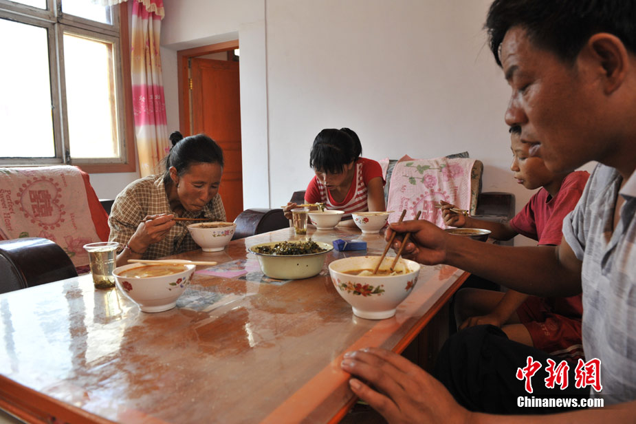 王旻桂的丈夫,因為早上去幫忙救災(zāi)弄傷了腿,她到家時飯還沒做。洗洗手后,王旻桂立即招呼兩個孩子開始準(zhǔn)備午飯,生火、揉面……,不一會,西北特色的湯面片就已經(jīng)上桌。