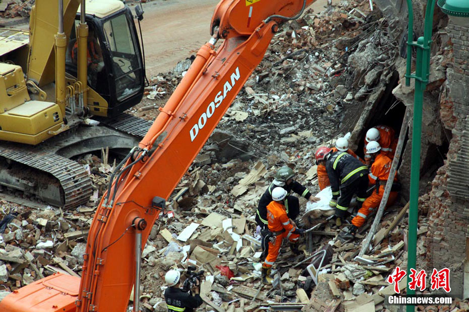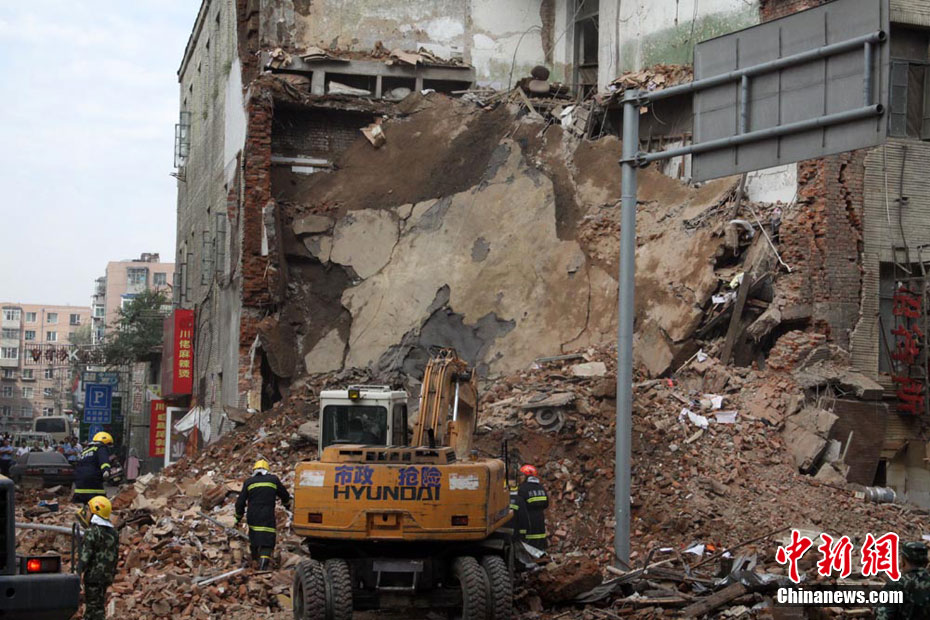 中新網(wǎng)長春8月12日電 (崔顏鋒 張?zhí)旎ⅲ?2日5時(shí)30分左右,位于長春市長春大街和大經(jīng)路交匯處的一棟老樓突然倒塌,目前已知有4人被埋在瓦礫中。截至上午10時(shí)50分,已有一人獲救,還有一人被發(fā)現(xiàn),但據(jù)稱已經(jīng)死亡。目前,救援人員正在繼續(xù)進(jìn)行搜救。圖為救援人員在現(xiàn)場(chǎng)搜救。 張策 攝