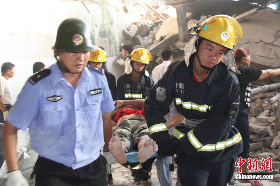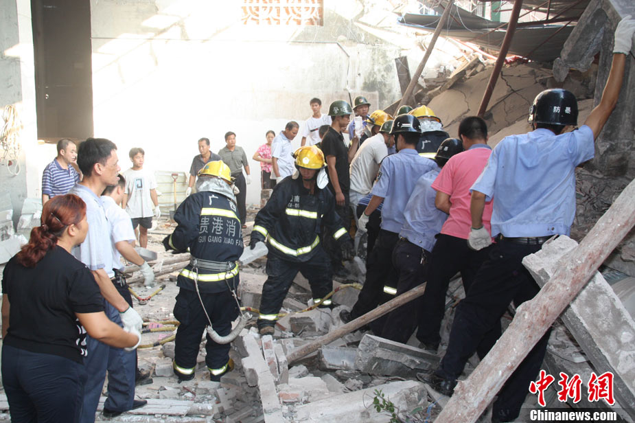 8月13日早晨,廣西貴港市橋圩鎮(zhèn)供銷社百貨門市部一棟3層的樓房突然倒塌,造成12名住戶被埋廢墟中。至上午10時(shí)50分,已知被埋人員被消防官兵全部救出,事故造成3人死亡9人受傷。中新社發(fā) 楊文福 攝
