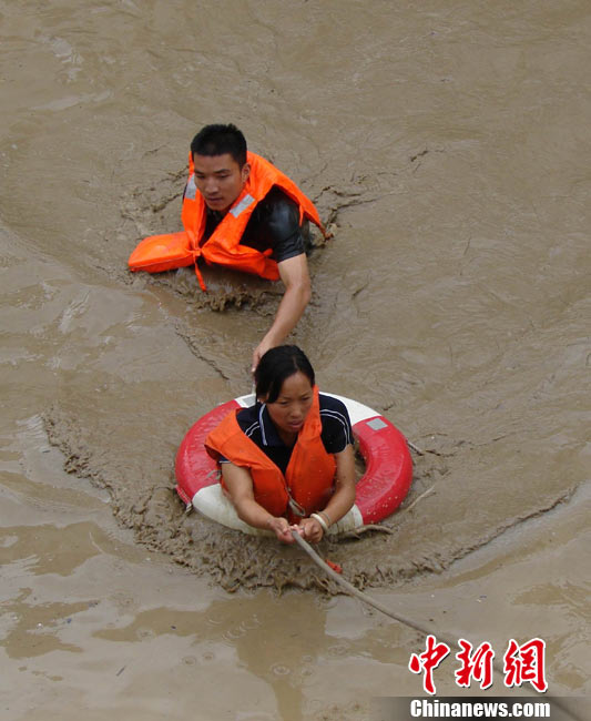 8月14日,四川德陽綿竹市清平、天池等山區(qū)遭遇暴雨泥石流襲擊,災(zāi)害發(fā)生后,德陽消防出動車輛20臺次,消防官兵123人次,從各類災(zāi)害事故中營救被困群眾26人,疏散群眾18人。圖為公安、消防、武警聯(lián)手營救被困村民。中新社發(fā) 沈消軒 攝