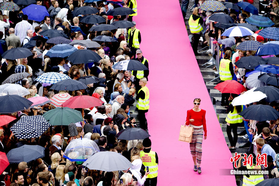 近日,為迎接哥本哈根時(shí)裝周,哥本哈根時(shí)裝協(xié)會(huì)專(zhuān)門(mén)在市中心建起了一條一英里長(zhǎng)(1.61公里)的粉紅色T臺(tái),成功打破“最長(zhǎng)T臺(tái)”的世界紀(jì)錄。超過(guò)10萬(wàn)名觀(guān)眾聚集在T臺(tái)旁欣賞時(shí)裝秀。