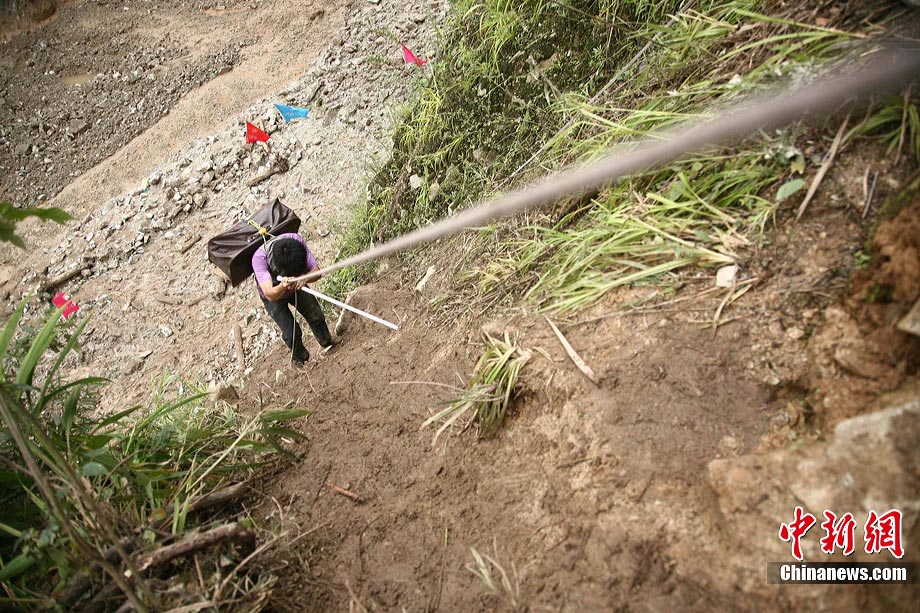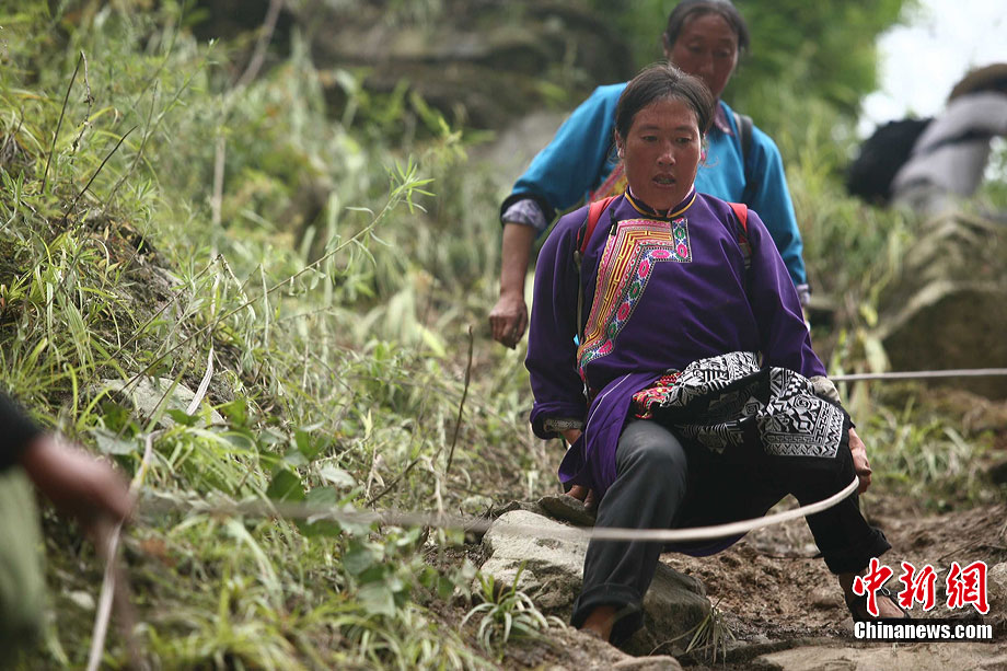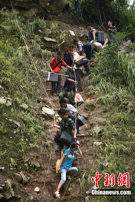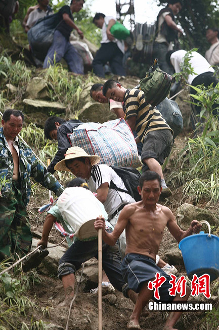 8月18日,汶川地區(qū)普降暴雨,岷江河水位再度上漲,由于汶川境內(nèi)213國(guó)道仍然處于中斷狀態(tài),受災(zāi)群眾依然只能徒步翻山越嶺撤離家園,部分山勢(shì)陡峭,群眾只能靠繩索通往。中新社發(fā) 張浪 攝