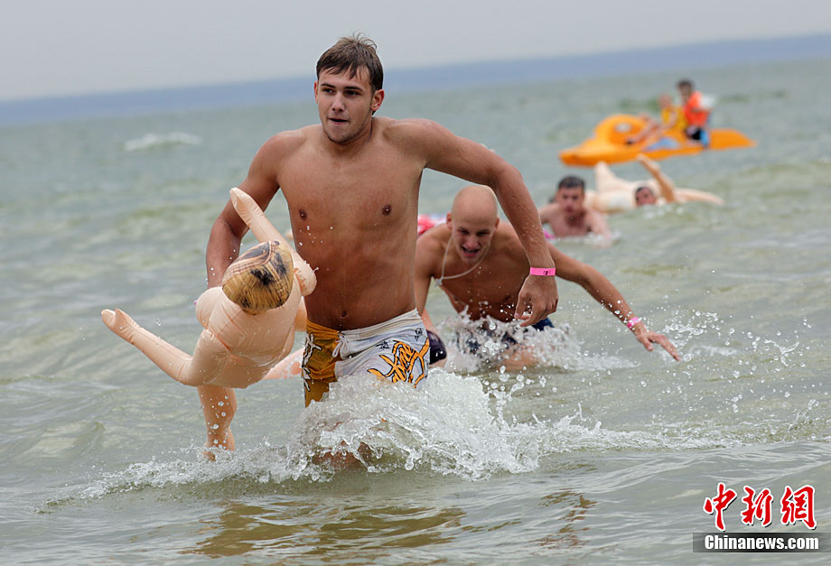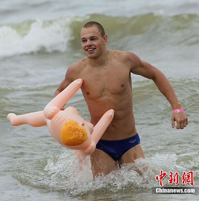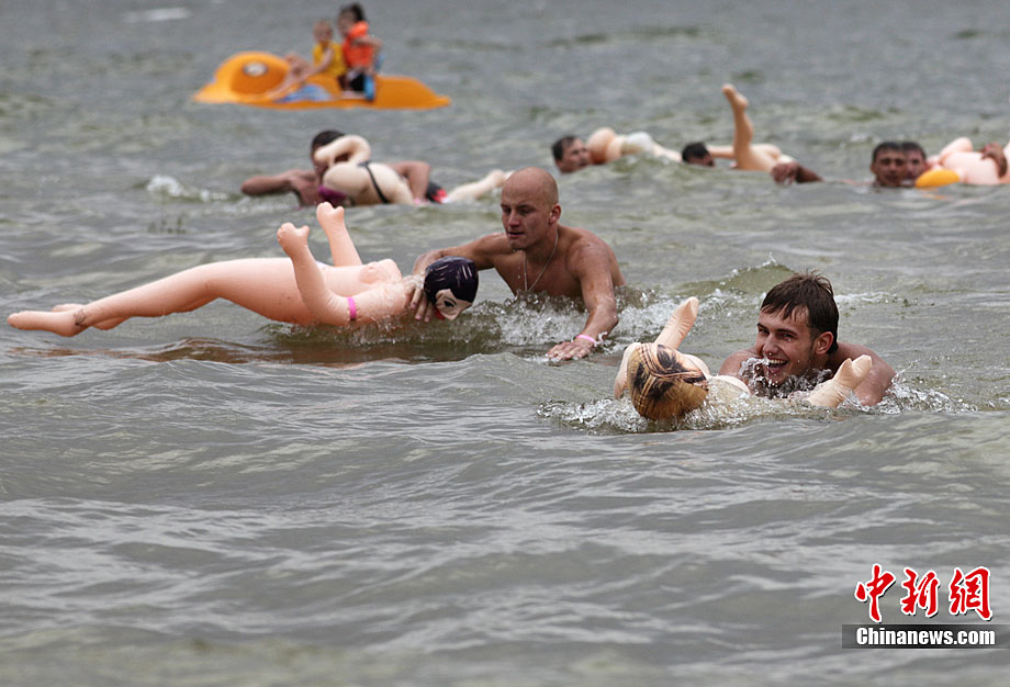 俄羅斯搞笑游泳比賽 懷抱“充氣娃娃”游泳