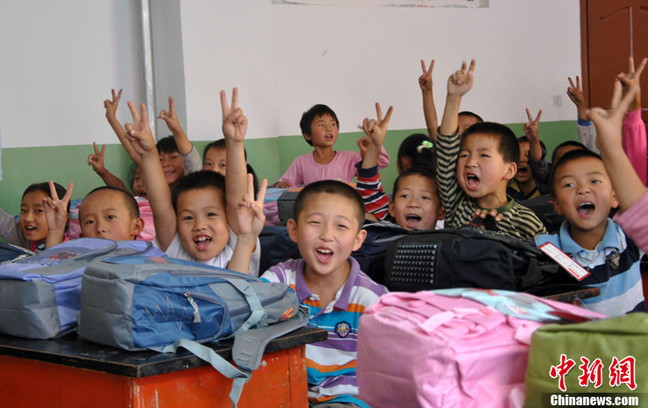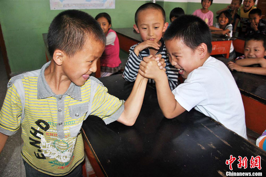 8月24日是甘肅舟曲小學(xué)生開學(xué)的前一天,當(dāng)?shù)貙W(xué)生領(lǐng)到新書包后格外興奮,兩個小男生在課桌上扳起手腕,平添快樂氛圍。中新社記者 馬曉俊 攝