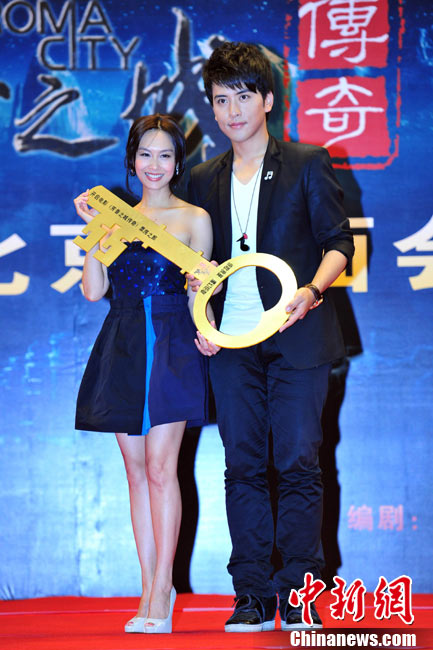 8月25日,電影《芳香之城傳奇》在北京舉行記者會(huì)。不老的“紫霞仙子”朱茵攜主演扎西頓珠、張達(dá)明、李子雄、張璇、董立范等亮相。朱茵以一襲抹胸短裙亮相,自曝在新片中大轉(zhuǎn)型,飾演一個(gè)有天然體香的神秘啞女,男主角扎西頓珠飾演的“富二代”被其吸引后,上演了一段純美姐弟戀。朱茵在接受采訪時(shí)坦言自己并不拒絕姐弟戀。圖為朱茵、扎西頓珠現(xiàn)場(chǎng)秀親昵。中新社記者 李學(xué)仕 攝