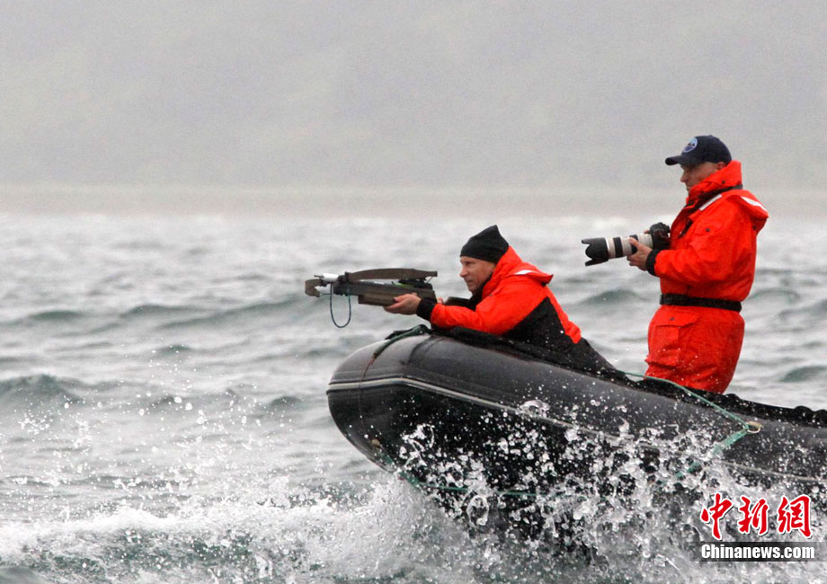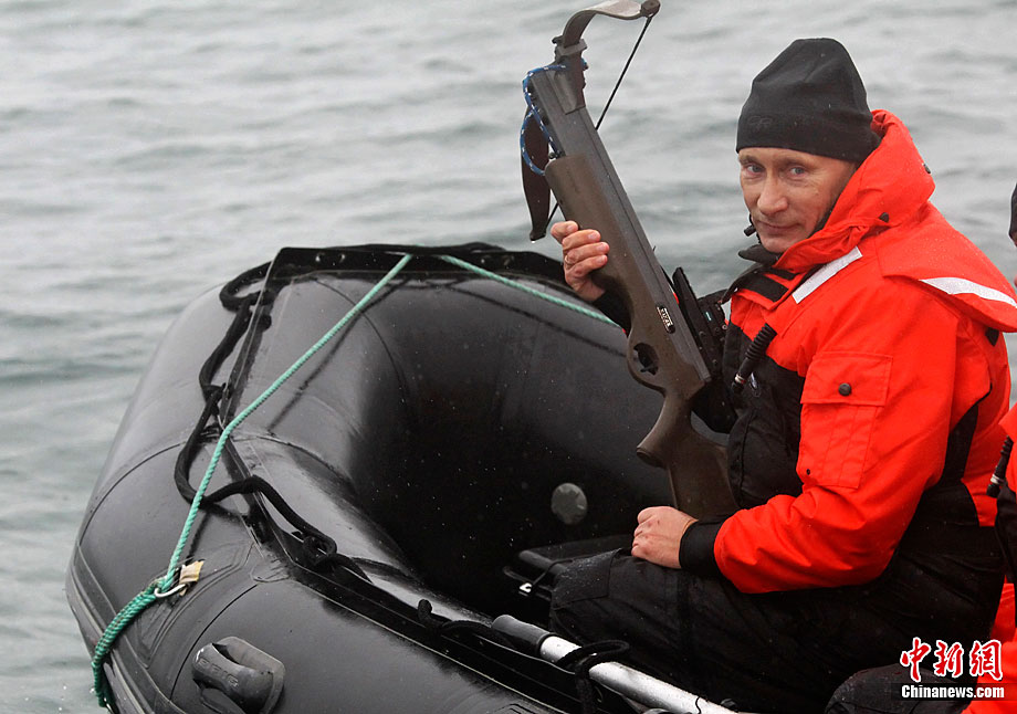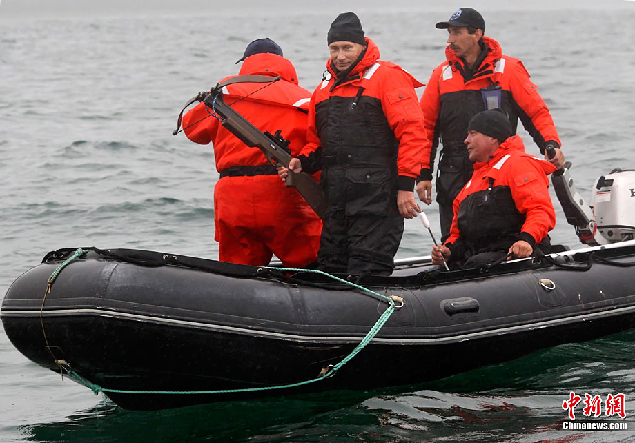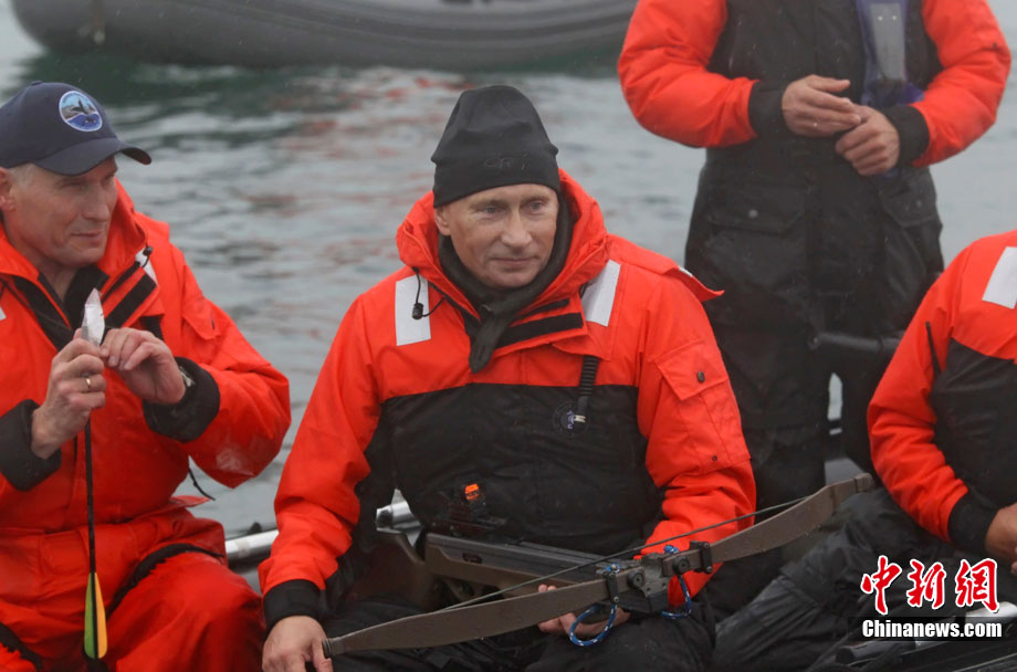 當(dāng)?shù)貢r(shí)間8月25日,俄羅斯總理普京在勘察加半島附近的奧爾加港參與科學(xué)考察時(shí),乘坐橡皮艇、手持勁弩,再次秀了一把射飛鏢獵捕灰鯨的風(fēng)采。