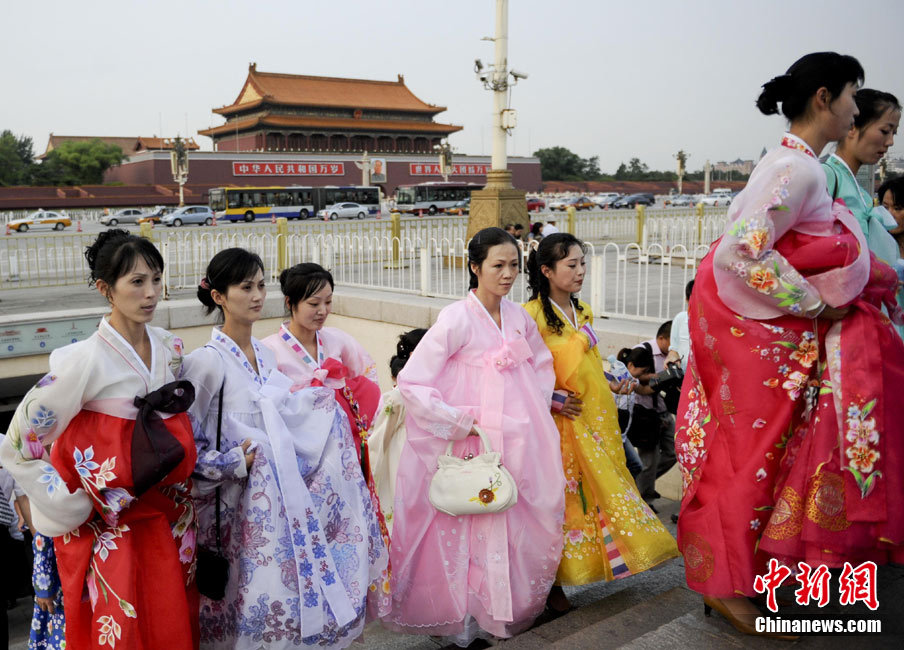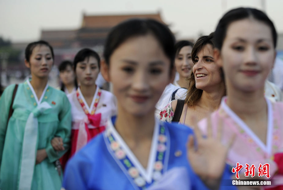 9月1日,朝鮮平壤藝術(shù)團(tuán)的藝術(shù)家參觀天安門(mén)廣場(chǎng)。當(dāng)日,朝鮮平壤藝術(shù)團(tuán)在中國(guó)全國(guó)的巡演活動(dòng)正式啟動(dòng),平壤藝術(shù)團(tuán)將在上海世博、寧波、廣州、深圳、珠海、昆明、重慶、武漢等20多個(gè)城市巡演“怒放的金達(dá)萊”。中新社記者 廖攀 攝
