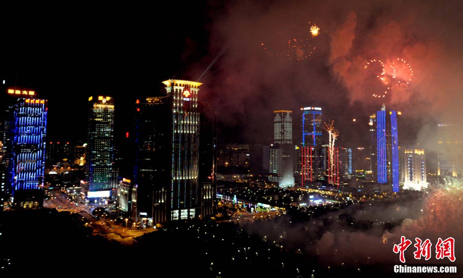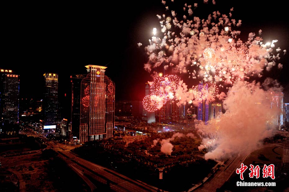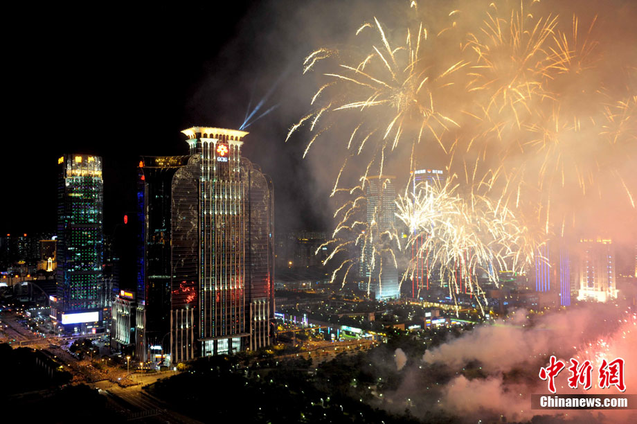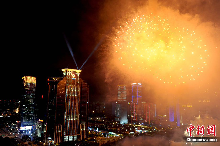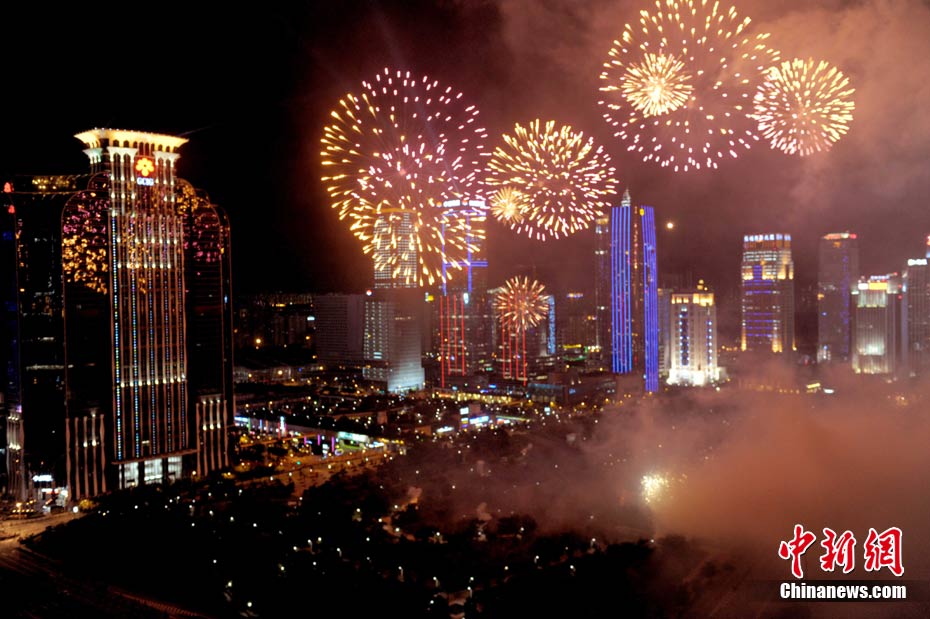 9月6日晚8點(diǎn)30分,深圳夜空璀璨絢麗,慶祝深圳經(jīng)濟(jì)特區(qū)建立30周年焰火晚會(huì)在深南大道水晶島舉行。今晚燃放煙花數(shù)量145107發(fā),主要品種19種,全長(zhǎng)30分鐘,共四個(gè)樂章。深圳市民分別在蓮花山公園、市民中心、深南路、彩田路、會(huì)展中心等區(qū)域觀看深圳經(jīng)濟(jì)特區(qū)30周年慶典煙花晚會(huì)。中新社記者 陳文 攝