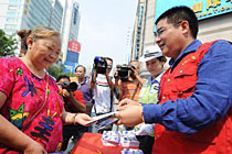 當?shù)貢r間9月7日凌晨,中國人民解放軍參加“和平使命-2010”上海合作組織聯(lián)合反恐軍事演習陸軍戰(zhàn)斗群第一列車梯隊參演官兵及裝備,順利抵達臨近演習現(xiàn)地的哈薩克斯坦奧塔爾市火車站。圖為哈薩克斯坦盛裝少女手捧當?shù)靥厣谰啤⒚朗吃谡九_上迎候中方參演官兵。中新社記者 孫自法攝