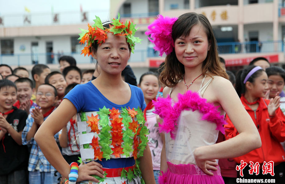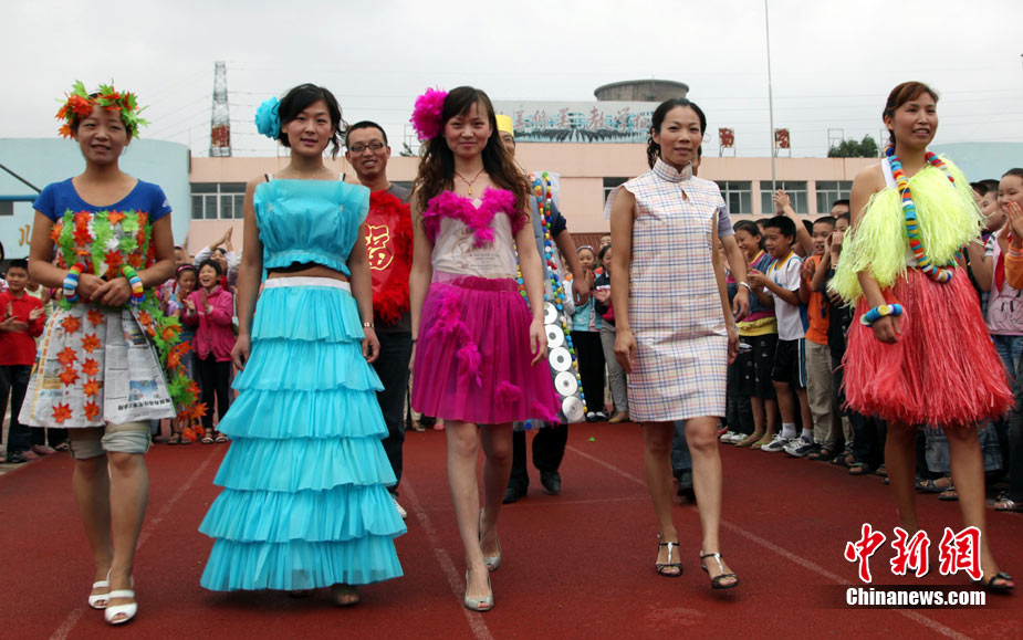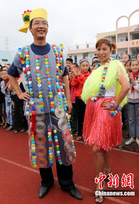 9月8日,山東省棗莊市市中區(qū)中興小學(xué)教師用舊報紙、光盤等廢舊物品制作的環(huán)!皶r裝”,向?qū)W生們進(jìn)行展示。他們用實際行動引導(dǎo)學(xué)生養(yǎng)成低碳生活的良好習(xí)慣,喜迎教師節(jié)到來。中新社發(fā) 吉 喆 攝 圖片來源:CNSPHOTO