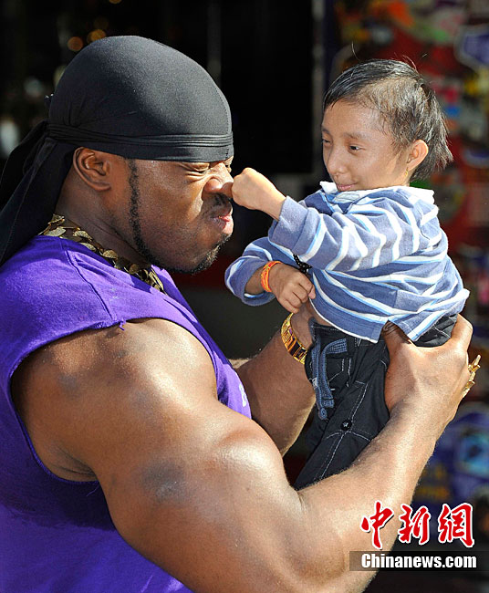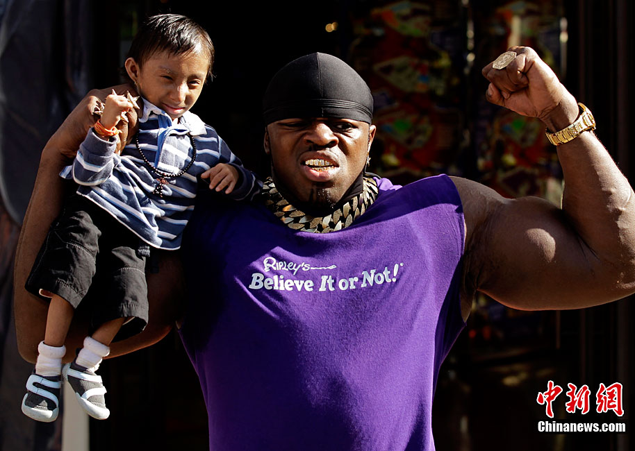 9月9日,全世界最矮男子——來(lái)自尼泊爾的馬嘉爾和英國(guó)胳膊最粗的男子安德魯.哈里森在倫敦參加“信不信由你”博物館的慶祝活動(dòng)。馬嘉爾17歲,是身高為56厘米;而28歲的哈里森的胳膊圍度達(dá)61厘米。但是塊頭大并不能給哈里森帶來(lái)多大便宜,相反小巧的馬嘉爾卻是靈活異常。