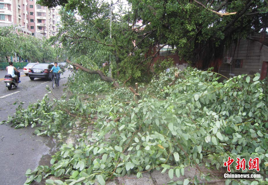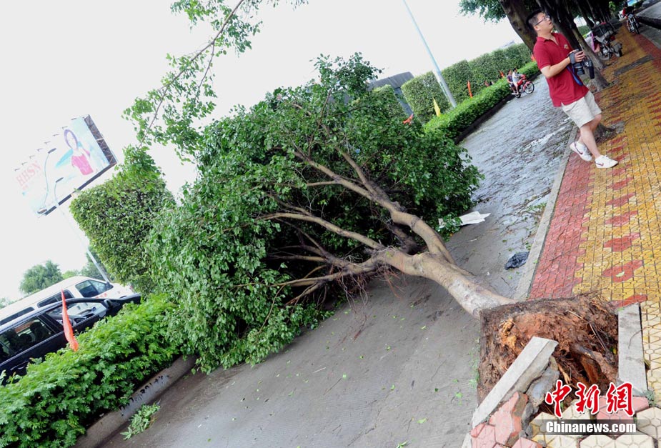 今年第10號臺風(fēng)“莫蘭蒂”10日凌晨3時30分登陸福建石獅,近中心最大風(fēng)力12級(35米/秒),給泉州帶來了狂風(fēng)暴雨。圖為9月10日上午臺風(fēng)過后、泉州市區(qū)觀音路上一棵被臺風(fēng)“莫蘭蒂”連根拔起的大樹,斜倒在路邊。中新社發(fā) 孫虹 攝