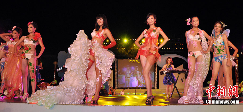 9月10日晚,在“中國茉莉之鄉(xiāng)”廣西南寧橫縣舉行的2010年中國國際茉莉花文化節(jié)上演人體花藝花繪魔幻秀。本屆茉莉花文化節(jié)將舉辦中國國際茉莉花文化節(jié)音樂節(jié)、中國花文化國際學術研討會、“花海·音樂之旅”觀光旅游活動、全國茉莉花茶市形勢分析會等活動。圖為模特秀花藝。中新社記者 楊志雄 攝