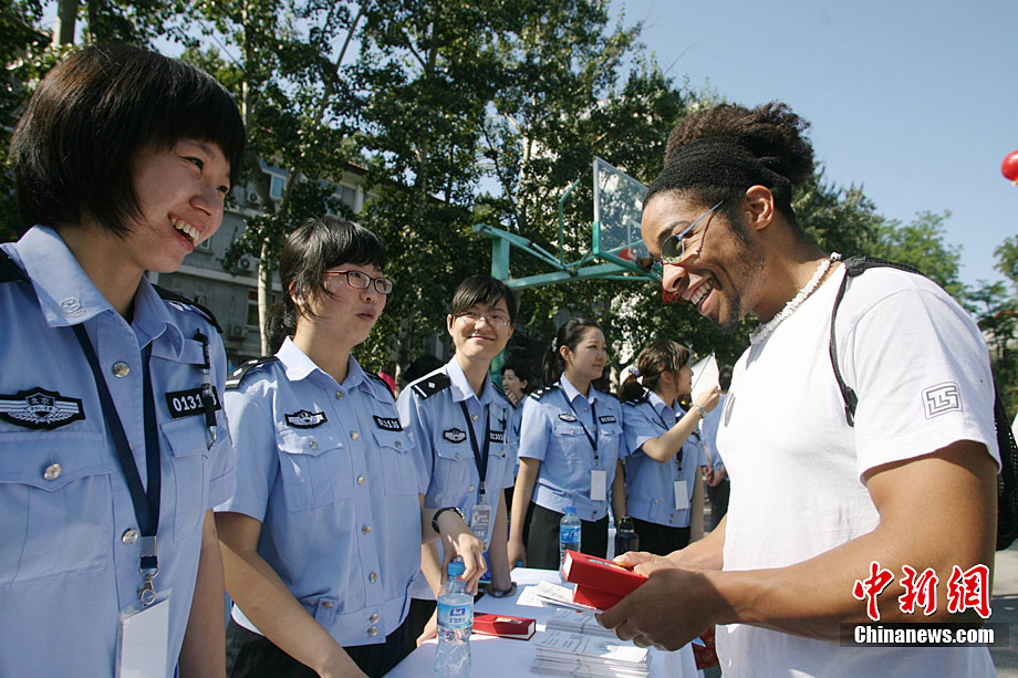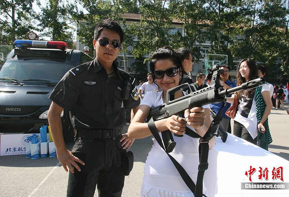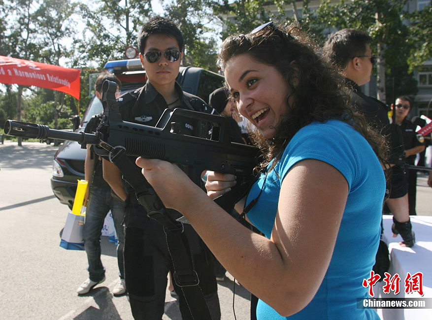 9月11日,北京語言大學一留學生在北京特警的講解下試用新型警用槍支。當日,北京市公安局在北京語言大學舉辦“平安北京進校園”主題活動。民警通過面對面的交流為外國留學生提供咨詢服務(wù),用英、德、西、日、韓5種語言,解答外國留學生在京居留、學習生活方面的各種問題,致力于提高外國留學生的安全感和滿意度。中新社發(fā) 蘇丹 攝