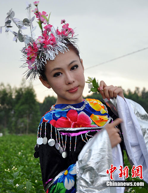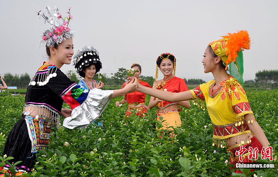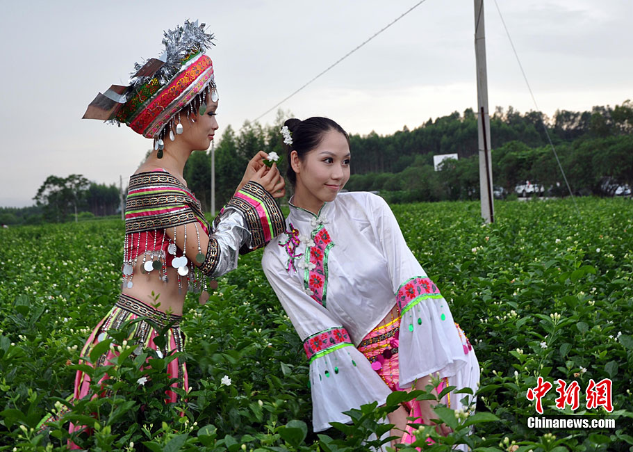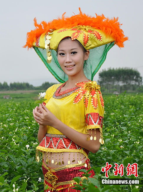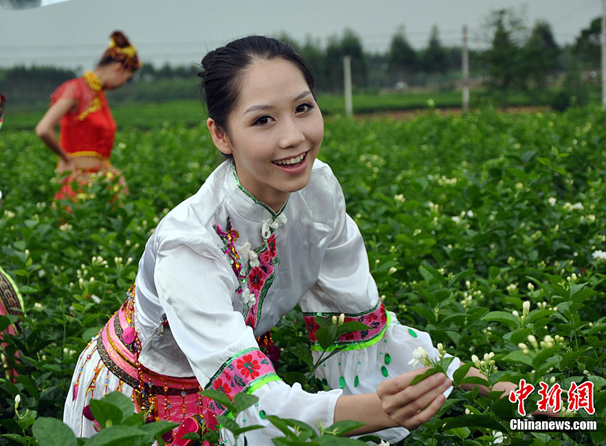 9月11日,“中國(guó)茉莉之鄉(xiāng)”廣西南寧橫縣,少數(shù)民族美女在“中華茉莉園”忙采茶。9月10日至12日,由中國(guó)花卉協(xié)會(huì)花文化專業(yè)委員會(huì)、中國(guó)茶葉流通協(xié)會(huì)茶館專業(yè)委員會(huì)和南寧市人民政府主辦的2010年中國(guó)國(guó)際茉莉花文化節(jié)在廣西橫縣舉行。橫縣是世界最大的茉莉花生產(chǎn)和花茶加工基地,茉莉花種植面積達(dá)到10萬(wàn)畝,花農(nóng)33萬(wàn)人,年產(chǎn)鮮花8萬(wàn)多噸,茉莉花產(chǎn)量和花茶加工總量均占全國(guó)80%以上,占世界的60%。中新社記者 楊志雄 攝