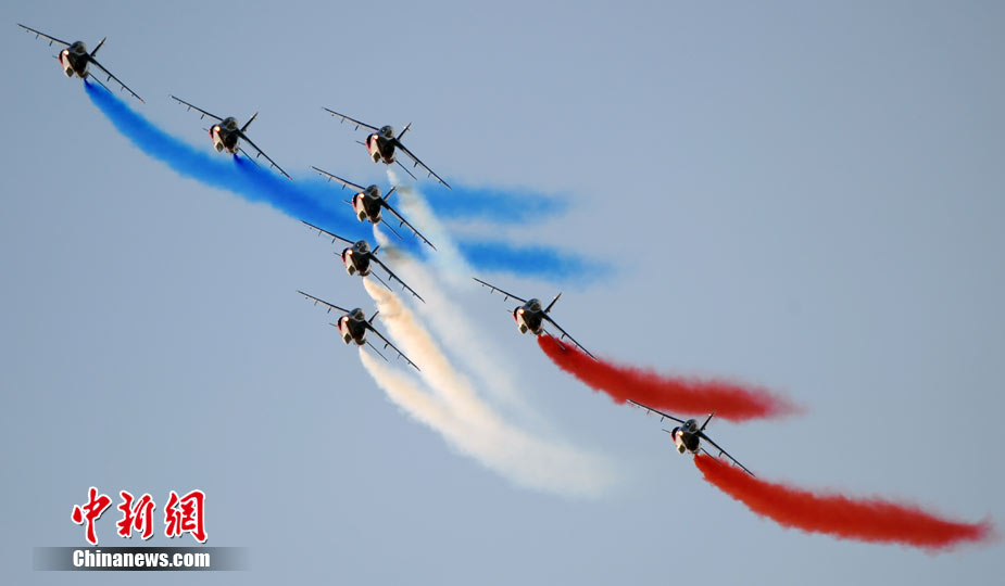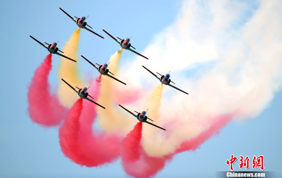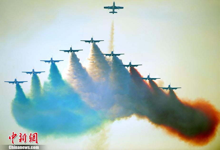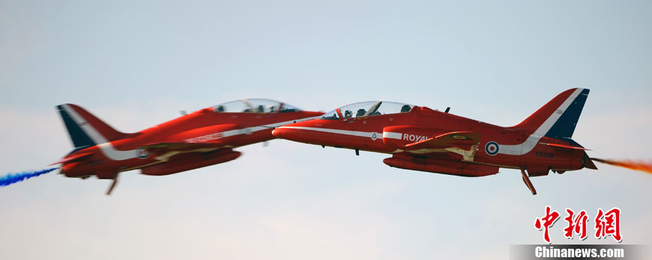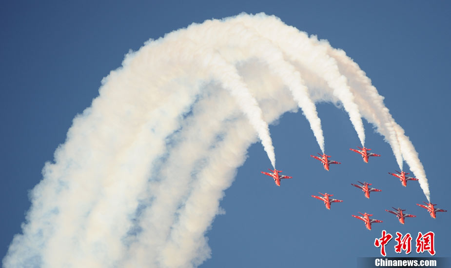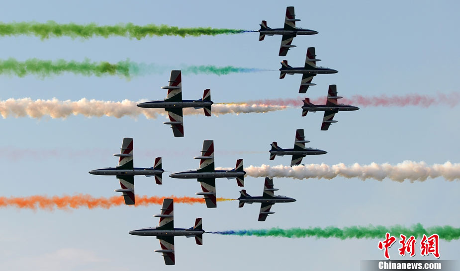 9月12日,為了慶祝意大利“三色箭”特技飛行表演隊成立50周年,多國飛行表演隊“齊聚”意大利,在Rivolto軍事基地進行了精彩的空中特技表演。圖為英國”紅箭“飛行表演隊進行特技表演。