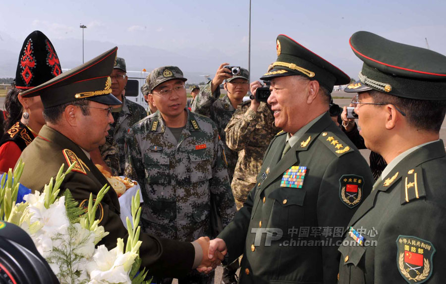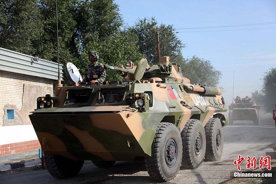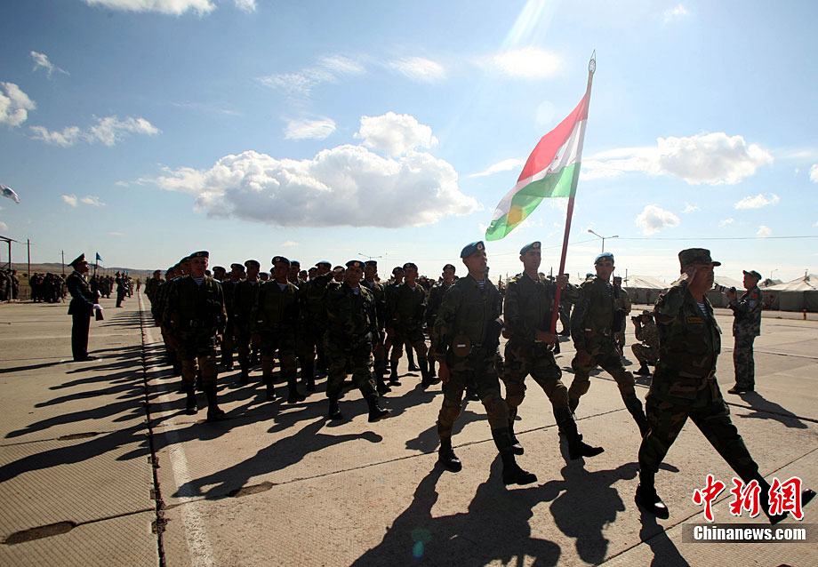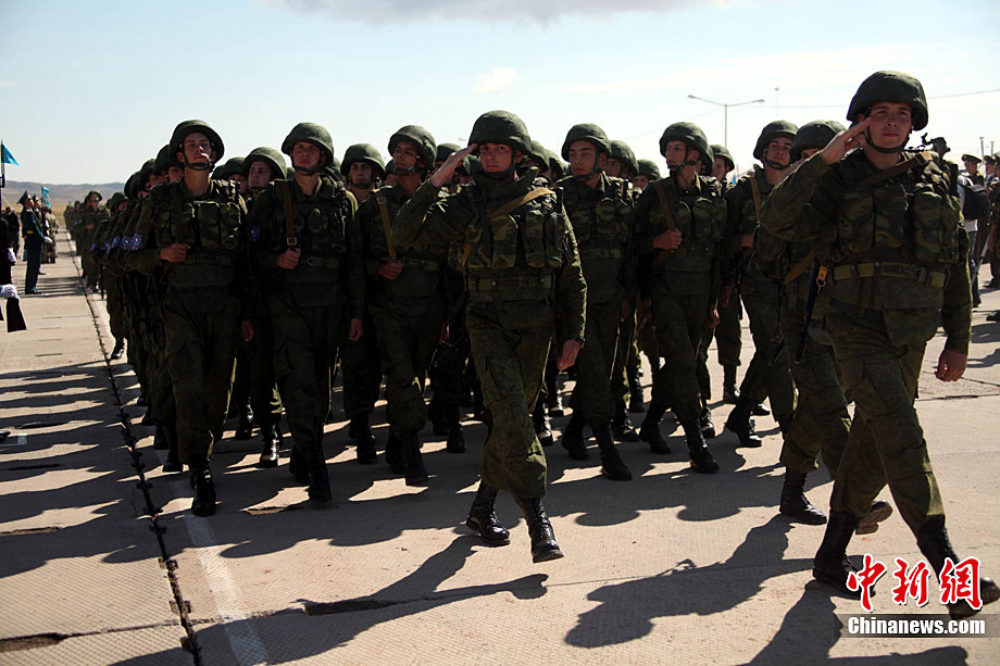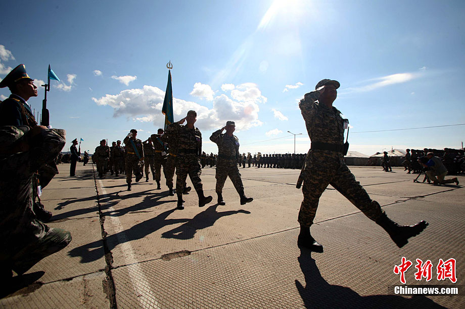 9月13日,“和平使命-2010”上海合作組織聯(lián)合反恐軍事演習(xí)在哈薩克斯坦馬特布拉克訓(xùn)練場舉行盛大的開訓(xùn)儀式,標(biāo)志著這次聯(lián)合軍演由戰(zhàn)役磋商階段正式轉(zhuǎn)入戰(zhàn)役準(zhǔn)備階段。隨后,哈、中、吉、俄、塔五方參演部隊(duì)依次舉行分列式,圖為中方參演部隊(duì)邁著矯健的步伐從開訓(xùn)儀式主席臺前列隊(duì)走過,接受檢閱。中新社記者 孫自法 攝