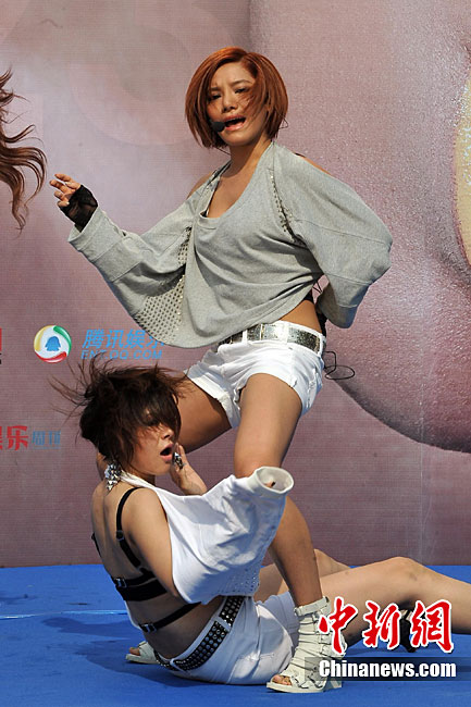 9月13日,09年快樂女聲冠軍VIVI江映蓉首張個人專輯《壞天使》全國媒體發(fā)布會在北京舉行。發(fā)布會上,置身于鐵籠子里的江映蓉由六名猛男抬上舞臺,她所散發(fā)出的女王般的氣勢與危險的性感氣息,抹殺了現(xiàn)場的大片菲林。江映蓉現(xiàn)場帶來了新專輯的主打歌《壞天使》,帶領(lǐng)眾舞者演繹火辣的她,跟隨節(jié)奏慢慢脫去身上的白色小外套,最后僅剩一件黑色十字比基尼在身,熱辣的舞蹈動作讓現(xiàn)場溫度直線上升。中新社記者 李學(xué)仕 攝